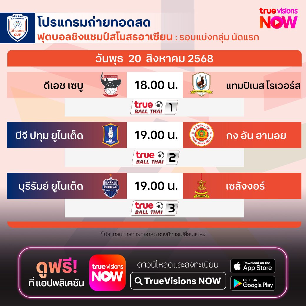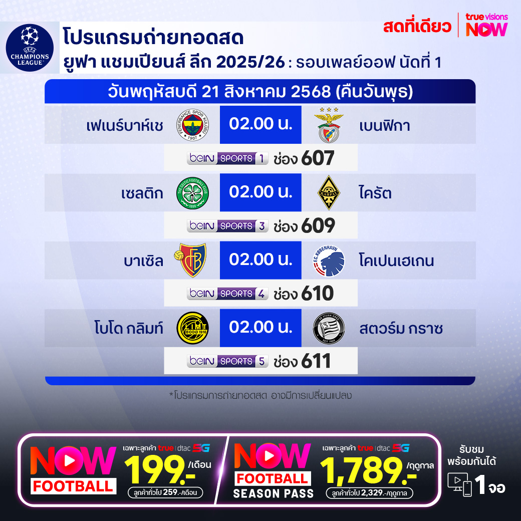 วันนี้มีอะไรดูที่ ทรูวิชั่นส์ ประจำวันพุธที่ 20 สิงหาคม 68 ยังคงมีกีฬาที่น่าสนใจให้ได้ตามลุ้นตามเชียร์กันเหมือนเดิม โดยในส่วนของฟุตบอลนั้น มีศึก ยูฟ่า แชมเปี้ยนส์ ลีก รอบเพลย์ออฟ และ ฟุตบอลชิงแชมป์สโมสรอาเซียน ให้ได้ตามเชียร์กันต่อเนื่อง ส่วนกีฬาอื่นๆ ยังมีเทนนิส ดับเบิ้ลยูทีเอ ทัวร์ รายการ มอนเทอร์เรย์ โอเพ่น, เมเจอร์ ลีก เบสบอล, กรีฑา ไดมอนด์ ลีก และ ฟุตซอลไทยลีก งานนี้ ทรูวิชั่นส์ จัดเต็มให้ชมกันถึงบ้าน