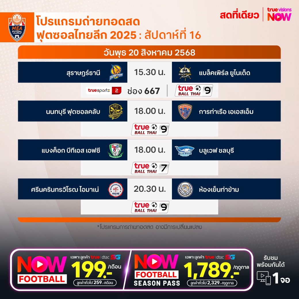 นนทบุรี ฟุตซอลคลับ พบ การท่าเรือ เอเอสเอ็ม เวลา 18.00 ทางช่อง True Ball Thai 9