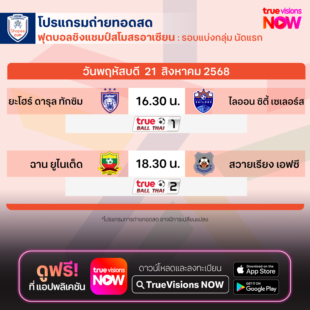 วันนี้มีอะไรดูที่ ทรูวิชั่นส์ ประจำวันพฤหัสบดีที่ 21 สิงหาคม 68 ยังคงมีกีฬาที่น่าสนใจให้ได้ตามลุ้นตามเชียร์กันเหมือนเดิม โดยในส่วนของฟุตบอลนั้น มีศึกชิงแชมป์สโมสรอาเซียน ให้ได้ตามเชียร์กันต่อเนื่อง ส่วนกีฬาอื่นๆ ยังมีเทนนิส ดับเบิ้ลยูทีเอ ทัวร์ รายการ มอนเทอร์เรย์ โอเพ่น, กอล์ฟ พีจีเอ ทัวร์ รายการ ทัวร์ แชมเปี้ยนชิพ, ดีพี เวิลด์ ทัวร์ รายการ บริติช มาสเตอร์ส, แอลพีจีเอ ทัวร์ รายการ ซีพีเคซี วีเมนส์ โอเพ่น, เมเจอร์ ลีก เบสบอล และ ฟุตซอลไทยลีก งานนี้ ทรูวิชั่นส์ จัดเต็มให้ชมกันถึงบ้าน