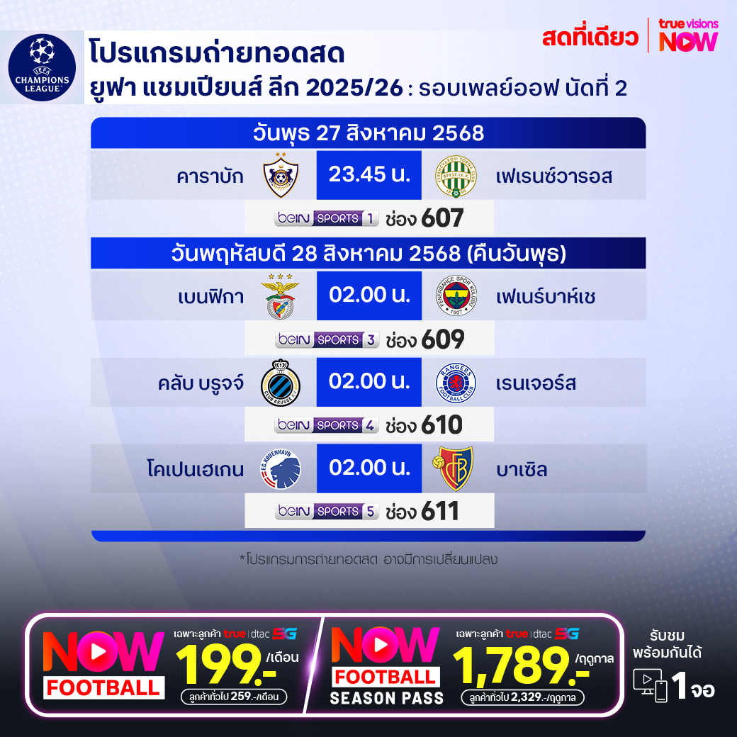 วันนี้มีอะไรดูที่ ทรูวิชั่นส์ ประจำวันพุธที่ 27 สิงหาคม 68 ยังคงมีกีฬาที่น่าสนใจให้ได้ตามลุ้นตามเชียร์กันเหมือนเดิม โดยในส่วนของฟุตบอลนั้น มีศึก ลา ลีกา สเปน, ยูฟ่า แชมเปี้ยนส์ ลีก รอบเพลย์ออฟ และ เดเอฟเบ โพคาล ให้ได้ตามเชียร์กันต่อเนื่อง ส่วนกีฬาอื่นๆ ยังมีศึกเทนนิส แกรนด์สแลม รายการ ยูเอส โอเพ่น, เวิลด์ สนุกเกอร์ ทัวร์ รายการ อู่ฮั่น โอเพ่น, แบดมินตัน บีดับเบิ้ลยูเอฟ รายการ เวิลด์ แชมเปี้ยนชิพ, เมเจอร์ ลีก เบสบอล และ กรีฑา ไดมอนด์ ลีก งานนี้ ทรูวิชั่นส์ จัดเต็มให้ชมกันถึงบ้าน