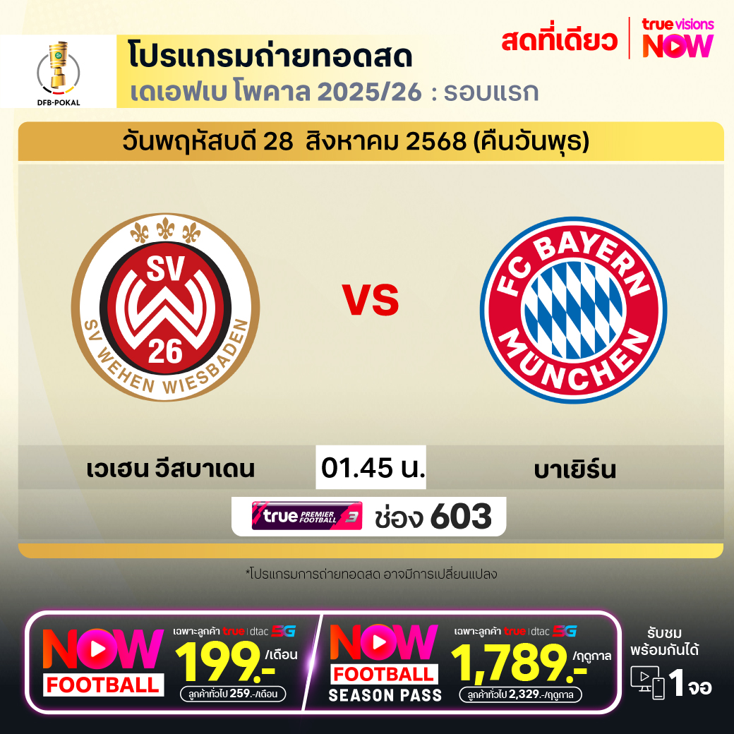 Wehen Wiesbaden vs Bayern เวลา 01.45-03.45 ทางช่องTPF 3(603)