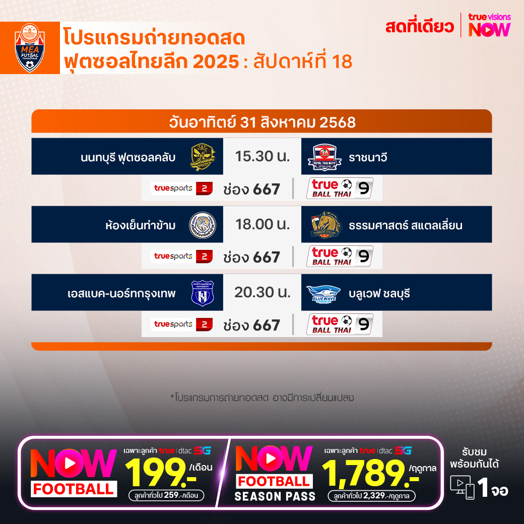 นนทบุรี ฟุตซอลคลับ พบ ราชนาวี เวลา 15.30 ทางช่อง TS 2 (667) / True Ball Thai 9