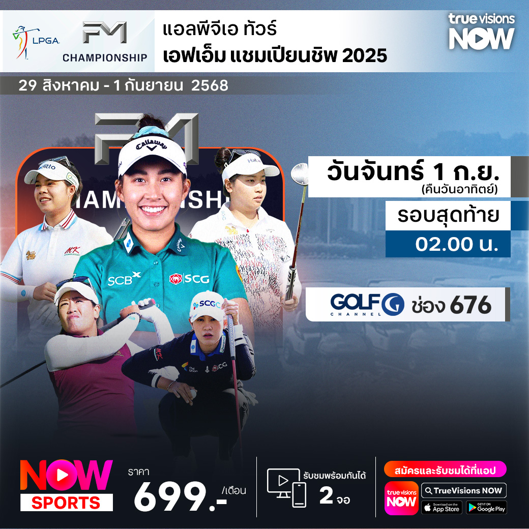 กอล์ฟหญิง แอลพีจีเอ ทัวร์ ฤดูกาล 2025 กำลังสนุกเข้มข้นกับการแข่งขันในสหรัฐอเมริกา สัปดาห์นี้เป็นการมาถึงของรายการสำคัญ เอฟเอ็ม แชมเปี้ยนชิพ จากสนาม ทีพีซี บอสตัน ในนอร์ตัน รัฐแมสซาจูเซ็ตต์ ชิงเงินรางวัลรวม 4.1 ล้านเหรียญสหรัฐฯ หรือประมาณ 133.6 ล้านบาท ร่วมเชียร์ไทยกับโปรสาวนับ 10 ชีวิต ที่พร้อมจะระเบิดสกอร์แย่งแชมป์กับมือระดับโลก ชมสด ครบทุกรอบ ที่ ทรูวิชั่นส์