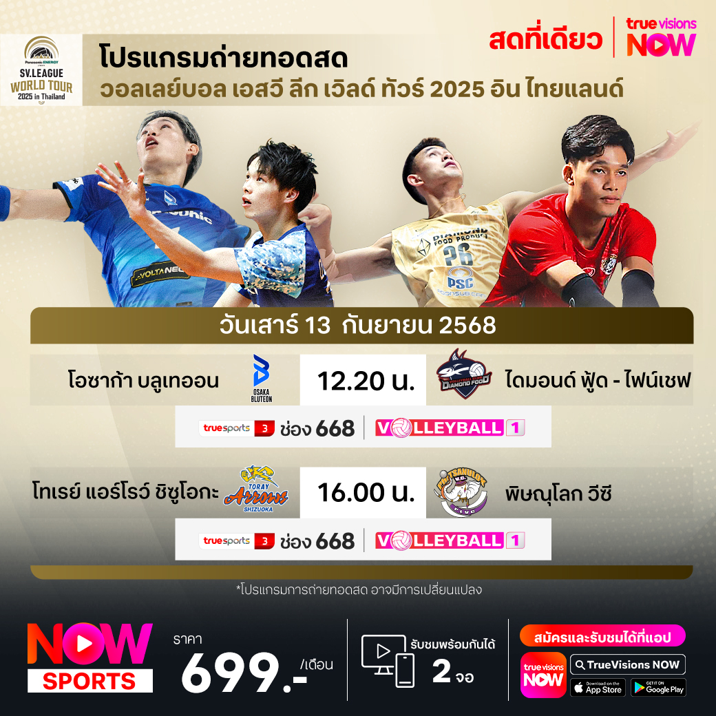 Osaka Bluteon vs. Diamond Food Fine Chef เวลา 12.20 ทางช่อง TS 3 (668) / Volleyball 1