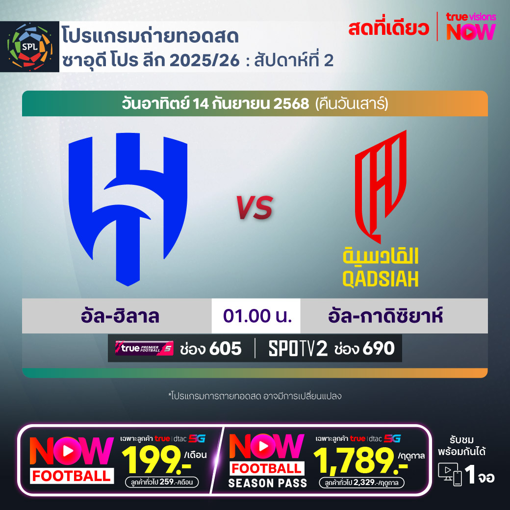 Al-Hilal vs Al-Qadisiyah เวลา 01.00-03.00 ทางช่องTPF 5(605) / SPOTV2 (690)