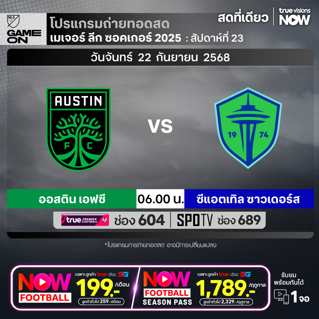 Austin FC vs Seattle Sounders FC เวลา 06.00-08.00 ทางช่องTPF 4(604)/SPOTV (689)