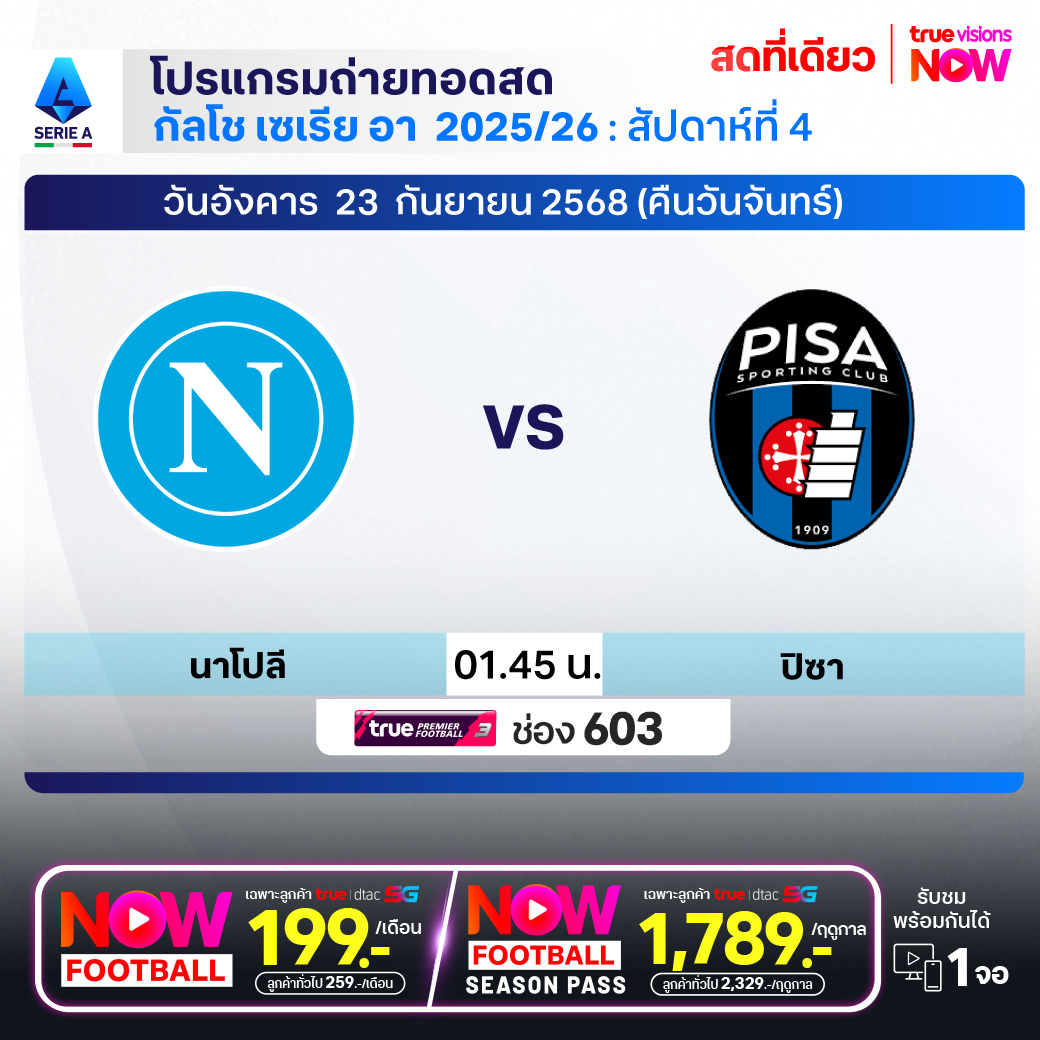 Napoli vs Pisa เวลา 01.45-03.45 ทางช่องTPF 3(603)