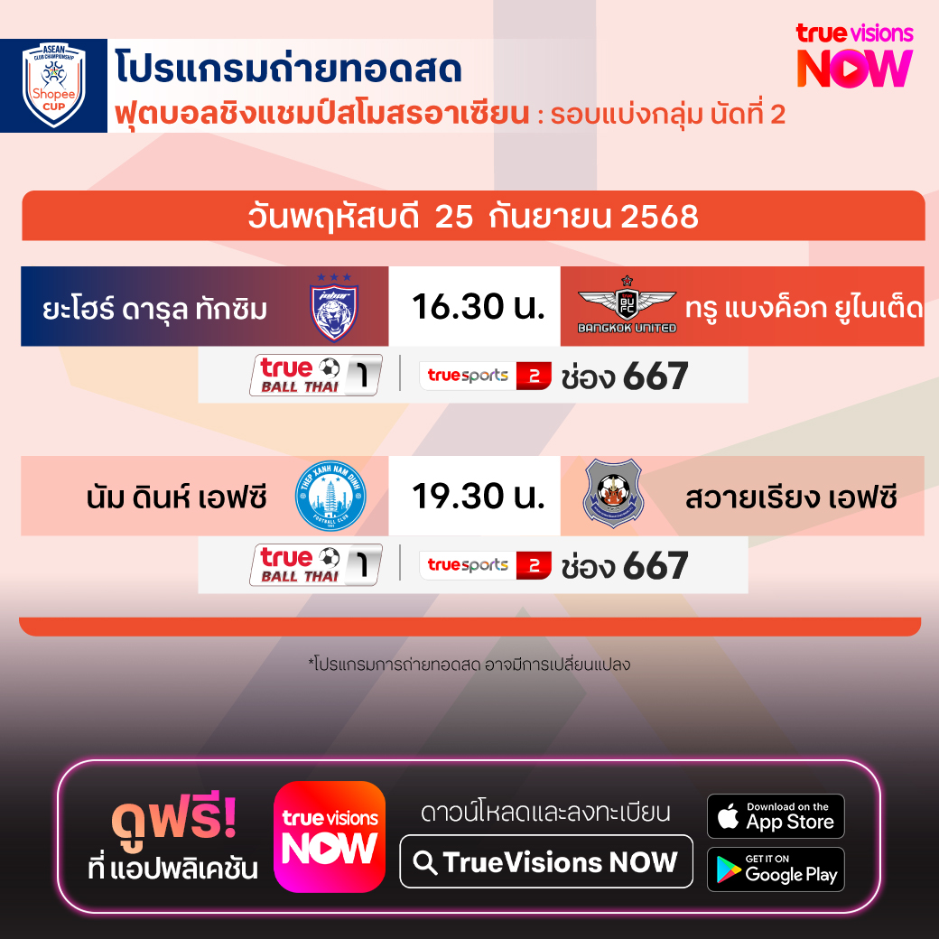 ยะโฮร์ ดารุล ทักซิม พบ ทรู แบงค็อก ยูไนเต็ด เวลา 16.30-18.30 ทางช่อง True Ball Thai 1 /TS 2 (667)