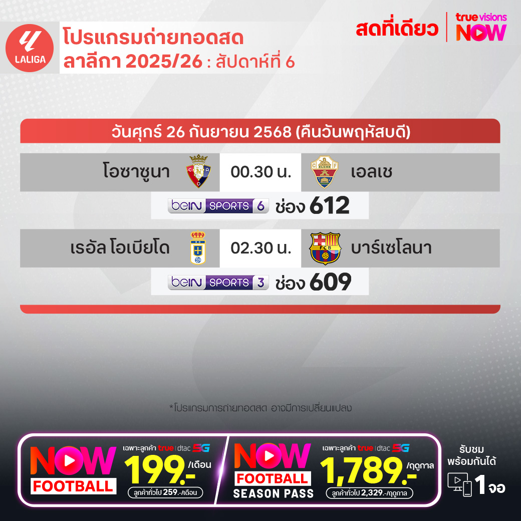 Osasuna vs Elche เวลา 00.30-02.30 ทางช่อง beIN 6 (612)