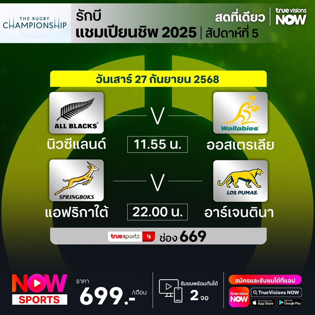 ยิ่งใหญ่ สมศักดิ์ศรีศึก 4 เส้าของ 4 ชาติมหาอำนาจแห่งซีกโลกใต้ เดอะ รักบี้ แชมเปี้ยนชิพ ปีนี้สู้กันสนุกสะใจแฟนๆ ผ่านไป 4 สัปดาห์ สถานการณ์ยังคู่คี่ มีโอกาสเท่าๆ กันในการก้าวขึ้นสู่ตำแหน่งแชมป์ในปีนี้ ต้องจับตาดูสองเกมสุดท้าย ทีมใดจะทำได้ดีกว่ากัน สัปดาห์นี้ นิวซีแลนด์ เปิดศึก ออสเตรเลีย และ แอฟริกาใต้ ปะทะ อาร์เจนติน่า ชมสด ครบทุกเกม ที่ ทรูวิชั่นส์