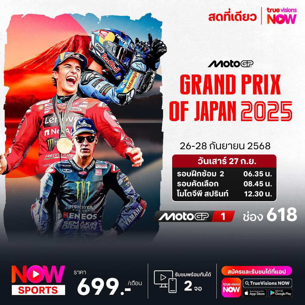 ศึก โมโต จีพี เวิลด์ แชมเปี้ยนชิพ สัปดาห์นี้ ข้ามทวีปมาโชว์ลีลาระดับโลกในเอเชีย ประเดิมที่ญี่ปุ่นกับรายการ กรังด์ปรีซ์ ออฟ แจแปน สนามที่ 17 ของฤดูกาล ที่สังเวียน โมบิลิตี้ รีสอร์ท โมเตกิ ลุ้นสดๆ ทั้ง 3 รุ่น แบบเอ็กซ์คลูซีฟ ทั้ง โมโต 3, โมโต 2 และ โมโต จีพี จับตาดูปีทองของ มาร์ก มาร์เกซ ซูเปอร์สตาร์ยอดนักบิดจากแดนกระทิงดุ เดินหน้าบิดรถคู่ใจคว้าแชมป์ ชมสด ครบทุกช่วงการแข่งขัน ที่ ทรูวิชั่นส์ ที่เดียว