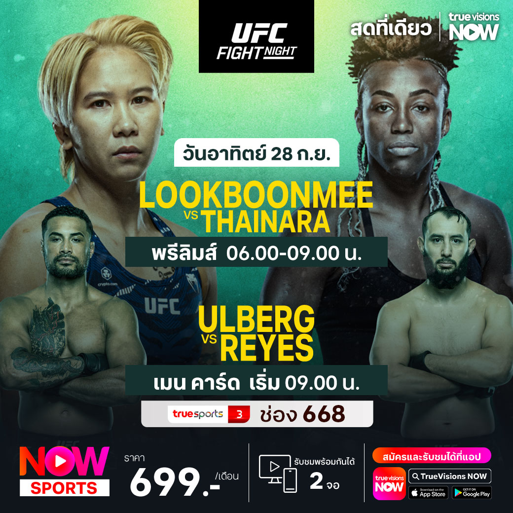 ร่วมส่งใจเชียร์ โลมา ลูกบุญมี สาวแกร่งจากบุรีรัมย์ นักสู้สาวหนึ่งเดียวจากประเทศไทยในศึก ยูเอฟซี ไฟต์ ไนท์ ขึ้นชกในช่วงพรีลิมส์ ของศึกใหญ่ อูลเบิร์ก ปะทะ เรเยส โดยจะพิสูจน์ฝีมือกับนักสู้สาวจากแดนแซมบ้า อเล็กเซีย ไทนาร่า ในรุ่นสตรอว์เวตหญิง ชมสด เอ็กซ์คลูซีฟ จุใจ จาก อาร์เอซี อารีน่า ในเพิร์ธ ประเทศออสเตรเลีย
