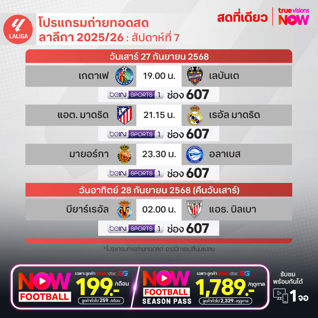 วันนี้มีอะไรดูที่ ทรูวิชั่นส์ ประจำวันเสาร์ที่ 27 กันยายน 68 ยังคงมีกีฬาที่น่าสนใจให้ได้ตามลุ้นตามเชียร์กันเหมือนเดิม โดยในส่วนของฟุตบอลยังมีศึก ลา ลีกา สเปน, บุนเดสลีกา เยอรมนี, กัลโช่ เซเรีย อา อิตาลี, สกอตติช พรีเมียร์ชิพ และ ซาอุดิ โปร ลีก ให้ได้ตามเชียร์กันต่อ ส่วนกีฬาอื่นๆ ยังมีศึก โมโต จีพี รายการ กรังด์ปรีซ์ ออฟ เจแปน, เทนนิส เอทีพี ทัวร์ รายการ เจแปน โอเพ่น และ ไชน่า โอเพ่น, ดับเบิ้ลยูทีเอ ทัวร์ รายการ ไชน่า โอเพ่น, กอล์ฟ เดอะ ไรเดอร์ คัพ 2025, เวิลด์ สนุกเกอร์ ทัวร์ รายการ บริติช โอเพ่น, แบดมินตัน บีดับเบิ้ลยูเอฟ รายการ โคเรีย โอเพ่น, ยูเอฟซี ไฟต์ ไนท์ และ รักบี้ แชมเปี้ยนชิพ งานนี้ ทรูวิชั่นส์ จัดเต็มให้ชมกันถึงบ้าน