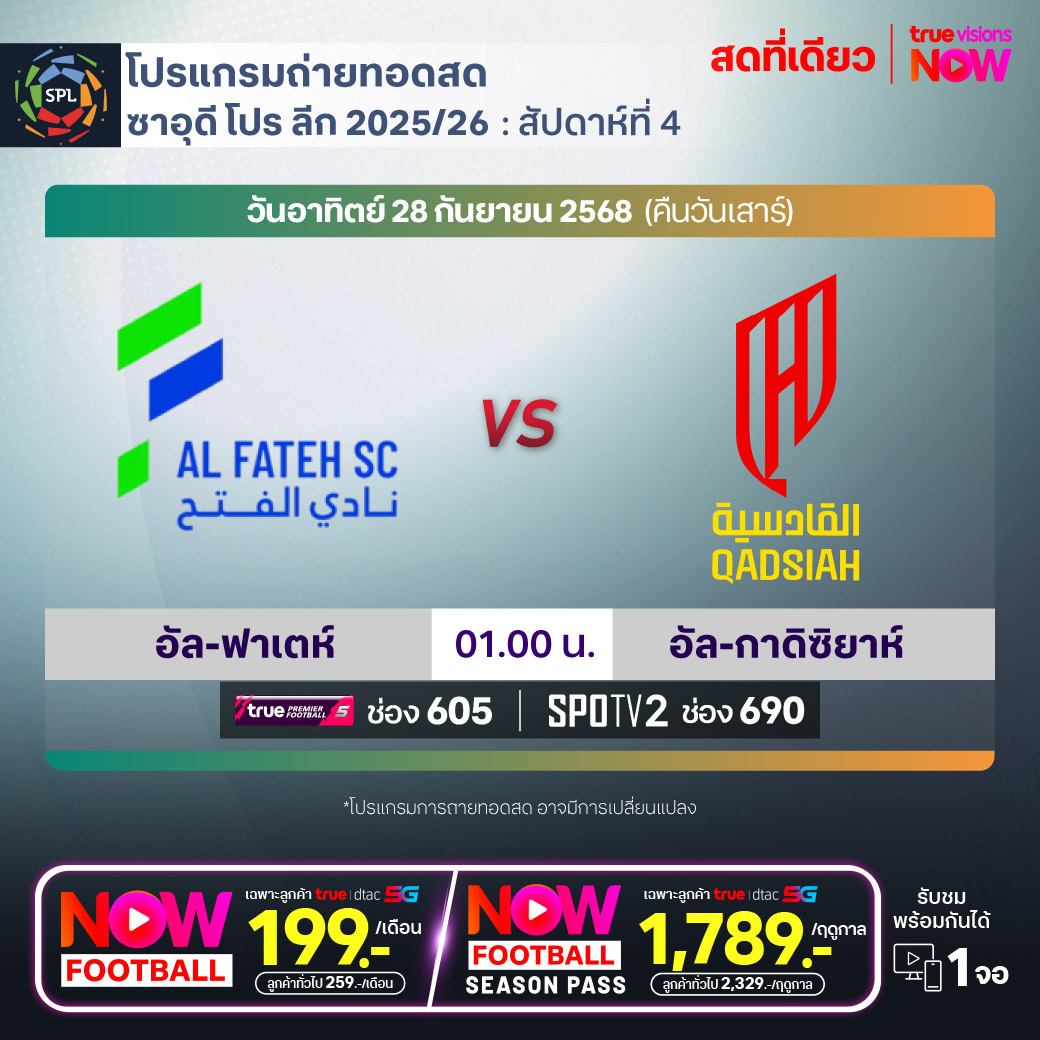 Al-Fateh vs Al-Qadsiah เวลา 01.00-03.00 ทางช่องTPF 5(605) / SPOTV2 (690)
