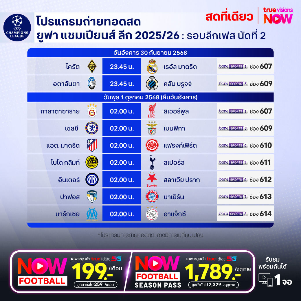 วันนี้มีอะไรดูที่ ทรูวิชั่นส์ ประจำวันอังคารที่ 30 กันยายน 68 ยังคงมีกีฬาที่น่าสนใจให้ได้ตามลุ้นตามเชียร์กันเหมือนเดิม โดยในส่วนของฟุตบอลยังมีศึก ยูฟ่า แชมเปี้ยนส์ ลีก รอบ ลีก เฟส ให้ได้ตามเชียร์กันต่อ ส่วนกีฬาอื่นๆ ยังมีศึกเทนนิส เอทีพี ทัวร์ รายการ เจแปน โอเพ่น และ ไชน่า โอเพ่น และเทนนิสหญิง ดับเบิ้ลยูทีเอ ทัวร์ รายการ ไชน่า โอเพ่น งานนี้ ทรูวิชั่นส์ จัดเต็มให้ชมกันถึงบ้าน