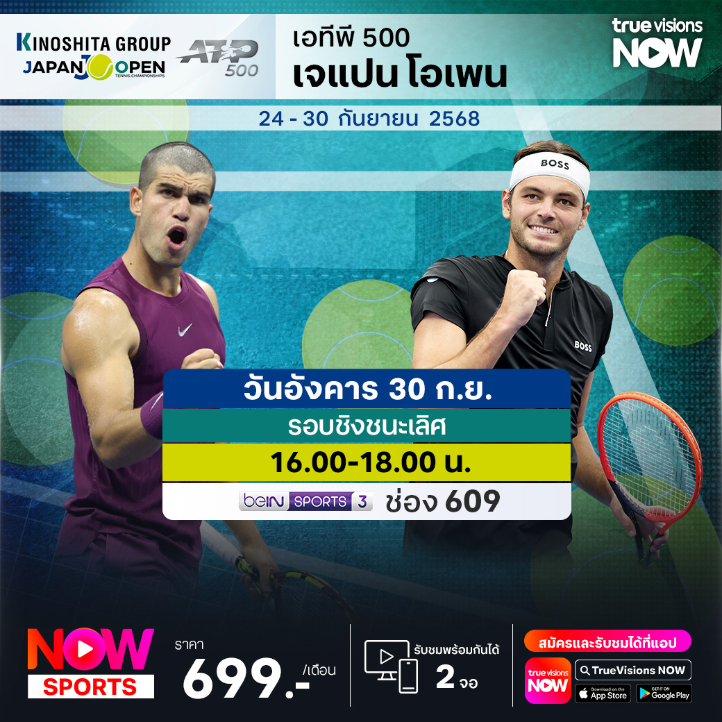 เทนนิสชาย เอทีพี ทัวร์ เข้าสู่ช่วงการแข่งขัน Asian Swing สัปดาห์นี้พบกับรายการใหญ่ที่กรุงโตเกียว ประเทศญี่ปุ่น กับรายการ เจแปน โอเพ่น นำโดย คาร์ลอส อัลคาราซ แชมป์แกรนด์แสลม 2 รายการในปี 2025 ร่วมลุ้นกันว่าใครจะคว้าแชมป์รายการนี้ไปครอง ชมสด ครบทุกรอบ ที่ ทรูวิชั่นส์