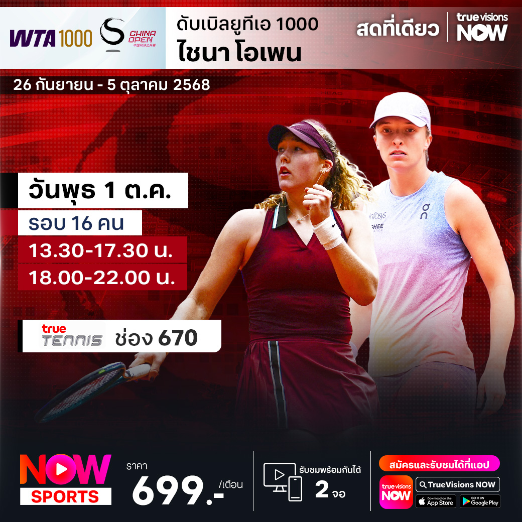 เทนนิสหญิง ดับเบิ้ลยูทีเอ ทัวร์ สัปดาห์นี้พบกับรายการใหญ่ที่สุดในทวีปเอเชีย ในรายการ ไชน่า โอเพ่น ที่กรุงปักกิ่ง ประเทศจีน นำโดยนักเทนนิสหญิงชื่อดังอย่าง อารีนา ซาบาเลนก้า และ อิกา ซิออนเทค ร่วมลุ้นกันว่าใครจะคว้าแชมป์รายการนี้ไปครอง ชมสด ครบทุกรอบ ที่ ทรูวิชั่นส์