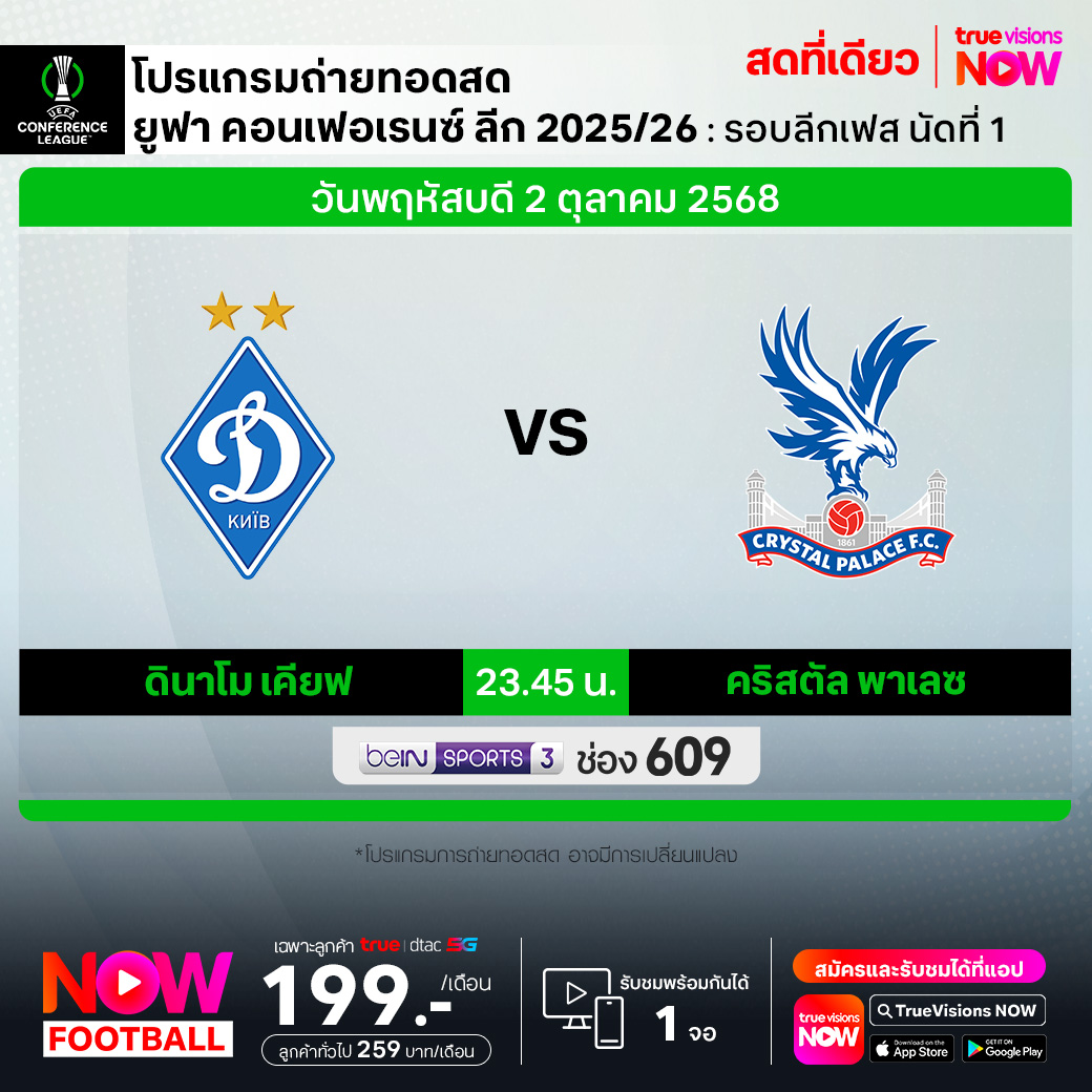 Dynamo Kyiv vs Crystal Palace เวลา 23.45-01.45 ทางช่อง beIN 3 (609)