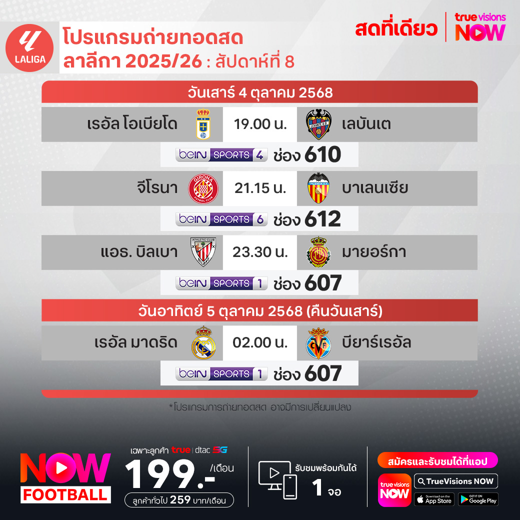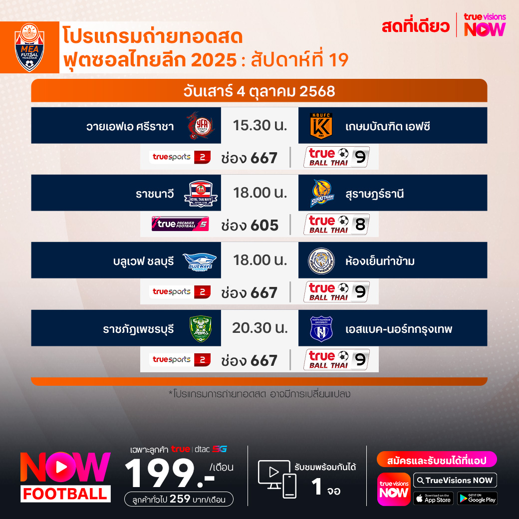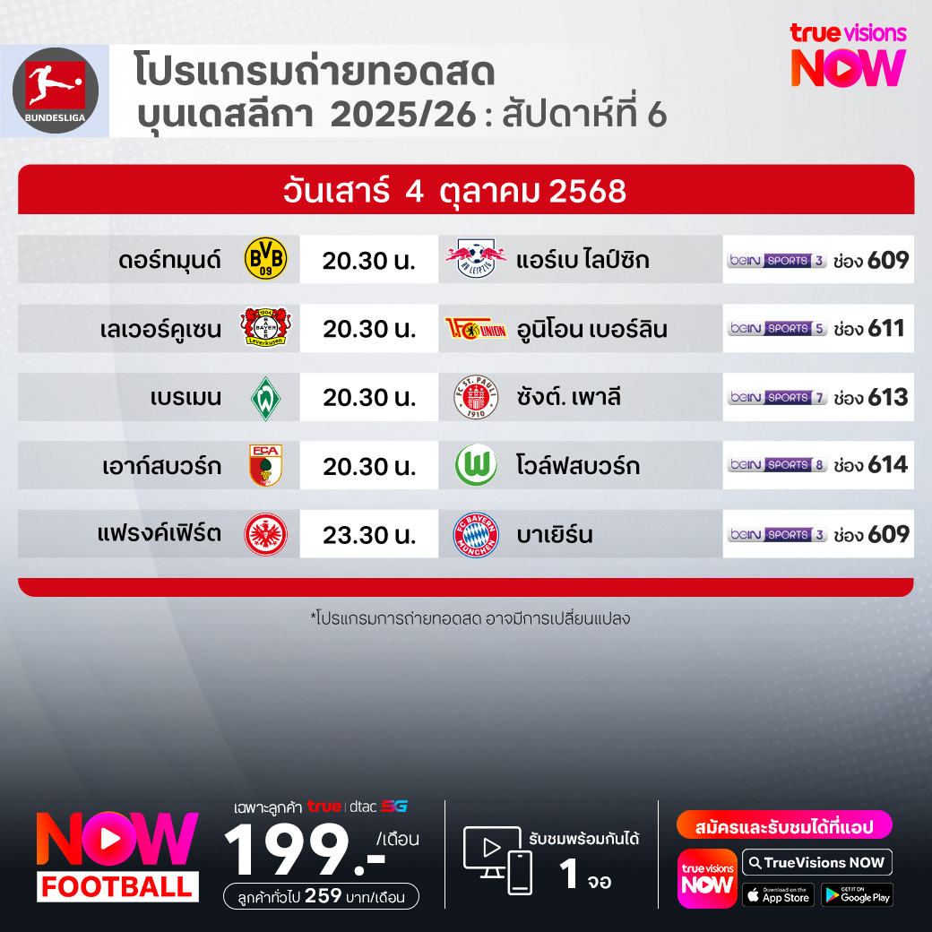 วันนี้มีอะไรดูที่ ทรูวิชั่นส์ ประจำวันเสาร์ที่ 4 ตุลาคม 68 ยังคงมีกีฬาที่น่าสนใจให้ได้ตามลุ้นตามเชียร์กันเหมือนเดิม โดยในส่วนของฟุตบอลยังมีศึก ลา ลีกา สเปน, บุนเดสลีกา เยอรมนี, กัลโช่ เซเรีย อา อิตาลี และ สกอตติช พรีเมียร์ชิพ ให้ได้ตามเชียร์กันต่อ ส่วนคอมอเตอร์สปอร์ต พลาดไม่ได้กับศึก ฟอร์มูล่า วัน รายการ สิงคโปร์ กรังด์ปรีซ์ และ โมโต จีพี รายการ กรังด์ปรีซ์ ออฟ อินโดนีเซีย ส่วนกีฬาอื่นๆ ยังมีศึกเทนนิส เอทีพี ทัวร์ รายการ เซี่ยงไฮ้ มาสเตอร์ส, เทนนิสหญิง ดับเบิ้ลยูทีเอ ทัวร์ รายการ ไชน่า โอเพ่น, กอล์ฟ พีจีเอ ทัวร์ รายการ แซนเดอร์สัน ฟาร์มส์ แชมเปี้ยนชิพ, ดีพี เวิลด์ ทัวร์ รายการ อัลเฟร็ด ดันฮิลล์ ลิงค์ส แชมเปี้ยนชิพ, พีจีเอ ทัวร์ แชมเปี้ยนส์ รายการ คอนสเตลเลชั่น ฟิวริก แอนด์ เฟรนด์ส, แอลพีจีเอ ทัวร์ รายการ ล็อตเต้ แชมเปี้ยนชิพ, ยูเอฟซี 320, ฟุตซอลไทยลีก และ วอลเลย์บอล อะคาเดมี่ ลีก งานนี้ ทรูวิชั่นส์ จัดเต็มให้ชมกันถึงบ้าน