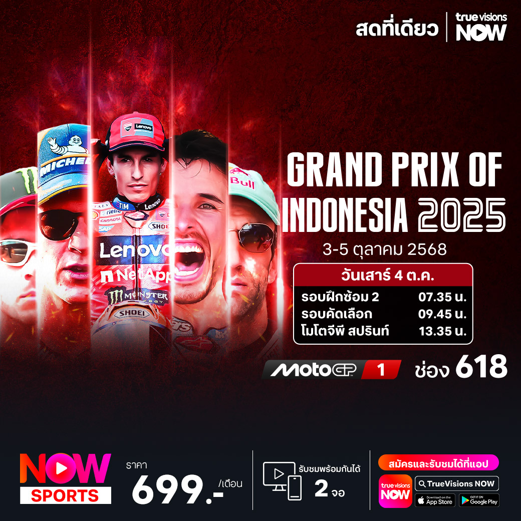 จับตาโค้งสุดท้ายของฤดูกาล 2025 กับศึก โมโต จีพี เวิลด์ แชมเปี้ยนชิพ สัปดาห์นี้เข้าสู่สนามที่ 18 ของฤดูกาล กับรายการที่สุดตื่นเต้นอย่าง กรังด์ปรีซ์ ออฟ อินโดนีเซีย ที่สังเวียน เพอร์ตามิน่า มันดาลิก้า เซอร์กิต ในลอมบัค อินโดนีเซีย จับตาดูสุดยอดนักบิดผู้ร้อนแรงแห่งปี มาร์ก มาร์เกซ จะแผลงฤทธิ์กวาดแชมป์เหนือคู่แข่งได้อีกสนามหรือไม่ และส่งใจเชียร์ "ก้อง" สมเกียรติ จันทรา นักบิดหนึ่งเดียวของไทย ชมสด ครบทุกช่วง ที่ ทรูวิชั่นส์
