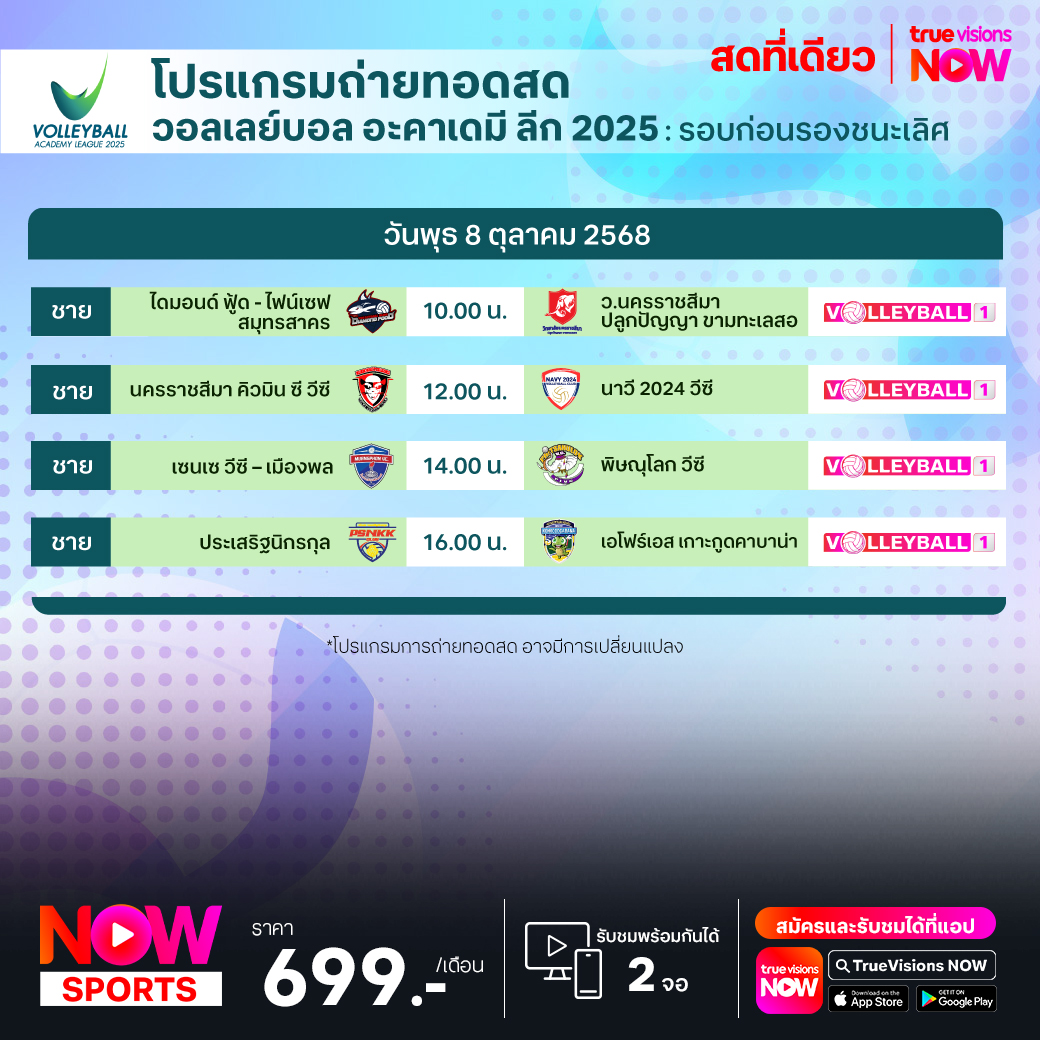 ไดมอนด์ ฟู้ด - ไฟน์เซฟ สมุทรสาคร พบ ว.นครราชสีมา ปลูกปัญญา ขามทะเลสอ เวลา 10.00 ทางช่อง Volleyball 1