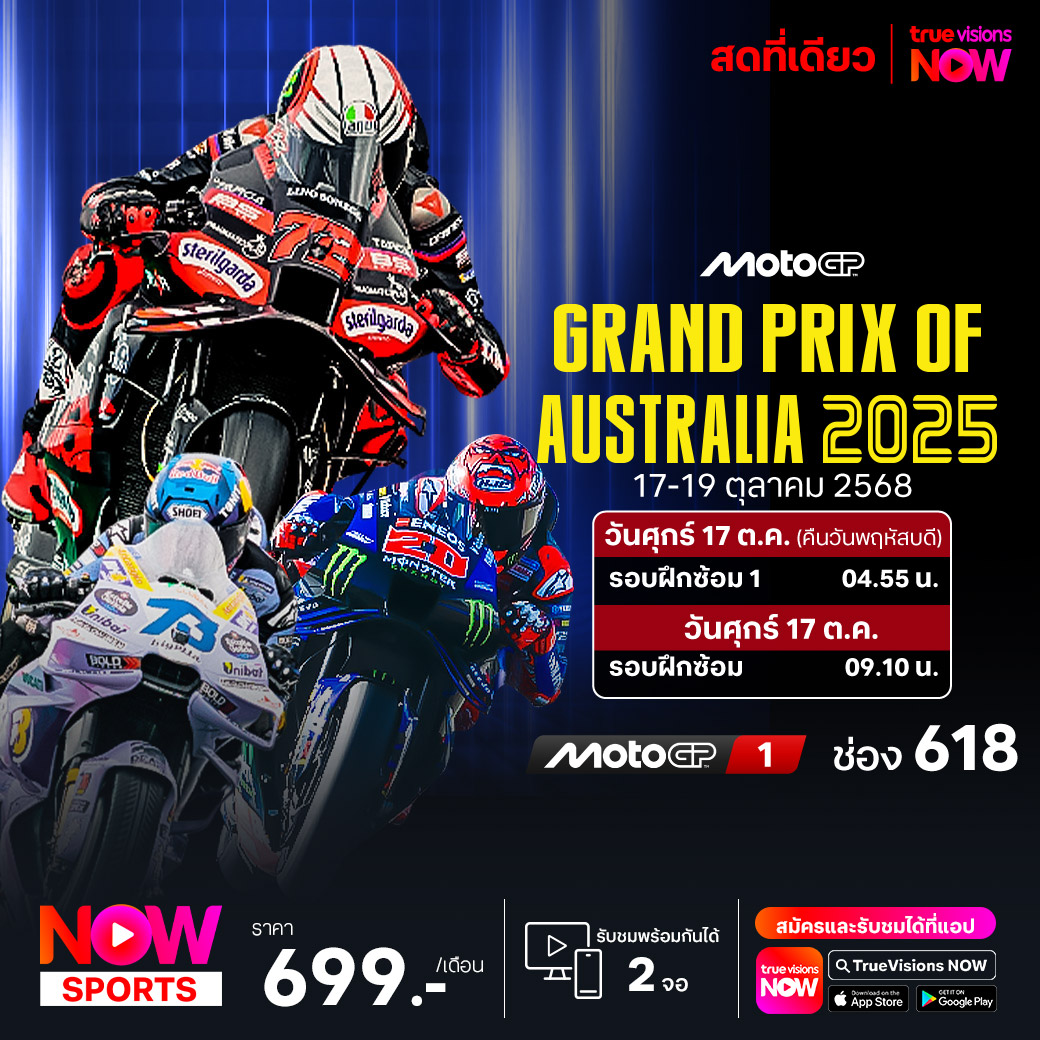 ศึกโมโต จีพี เวิลด์ แชมเปี้ยนชิพ ฤดูกาล 2025 สัปดาห์นี้พบกับรายการ กรังด์ปรีซ์ ออฟ ออสเตรเลีย จากสังเวียนสุดท้าทาย ฟิลลิป ไอส์แลนด์ ประเทศออสเตรเลีย ชมสด เอ็กซ์คลูซีฟ ครบทุกช่วง ทั้งรุ่นโมโต 3, โมโต 2 และโมโต จีพี ร่วมลุ้นกันว่าใครจะคว้าแชมป์สนามนี้ไปครอง ชมสด ครบทุกช่วงการแข่งขัน ที่ ทรูวิชั่นส์ ที่เดียว