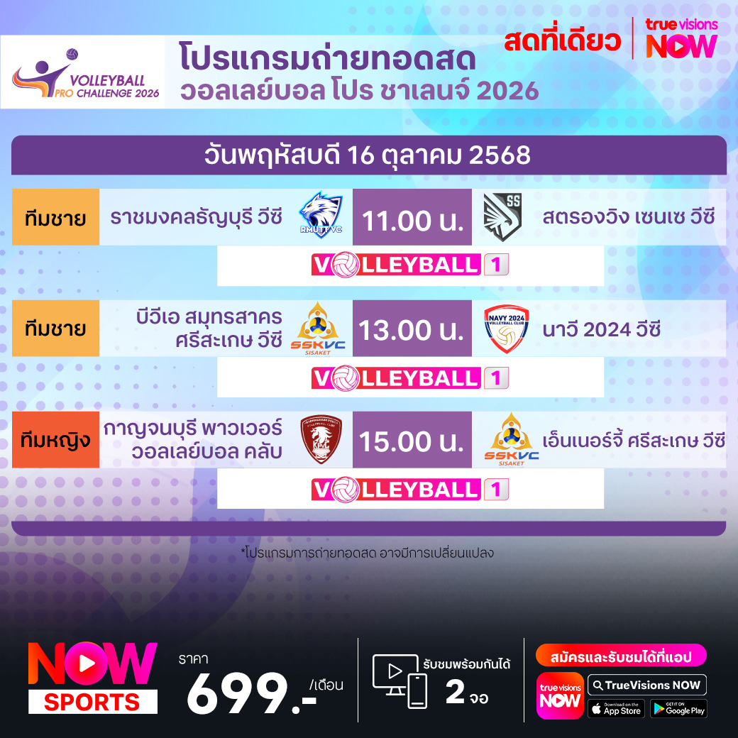 กาญจนบุรี พาวเวอร์ วอลเลย์บอล คลับ พบ เอ็นเนอร์จี้ ศรีสะเกษ วีซี เวลา 15.00 ทางช่อง Volleyball 1
