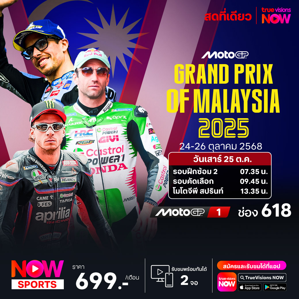 ศึก โมโต จีพี เวิลด์ แชมเปี้ยนชิพ การแข่งขันจักรยานยนต์ทางเรียบชิงแชมป์โลกอันดับ 1 ตลอดกาล เดินทางมาถึงสนามที่ 20 ของฤดูกาลแล้ว สั่งลาทวีปเอเชียกันด้วยรายการ กรังด์ปรีซ์ ออฟ มาเลเซีย ที่สนาม เซปัง อินเตอร์เนชั่นแนล เซอร์กิต กรุงกัวลาลัมเปอร์ ประเทศมาเลเซีย ชมสด ครบทุกช่วงการแข่งขันทั้ง 3 รุ่น ทั้ง โมโต 3, โมโต 2 และ โมโต จีพี เอ็กซ์คลูซีฟ ที่ ทรูวิชั่นส์