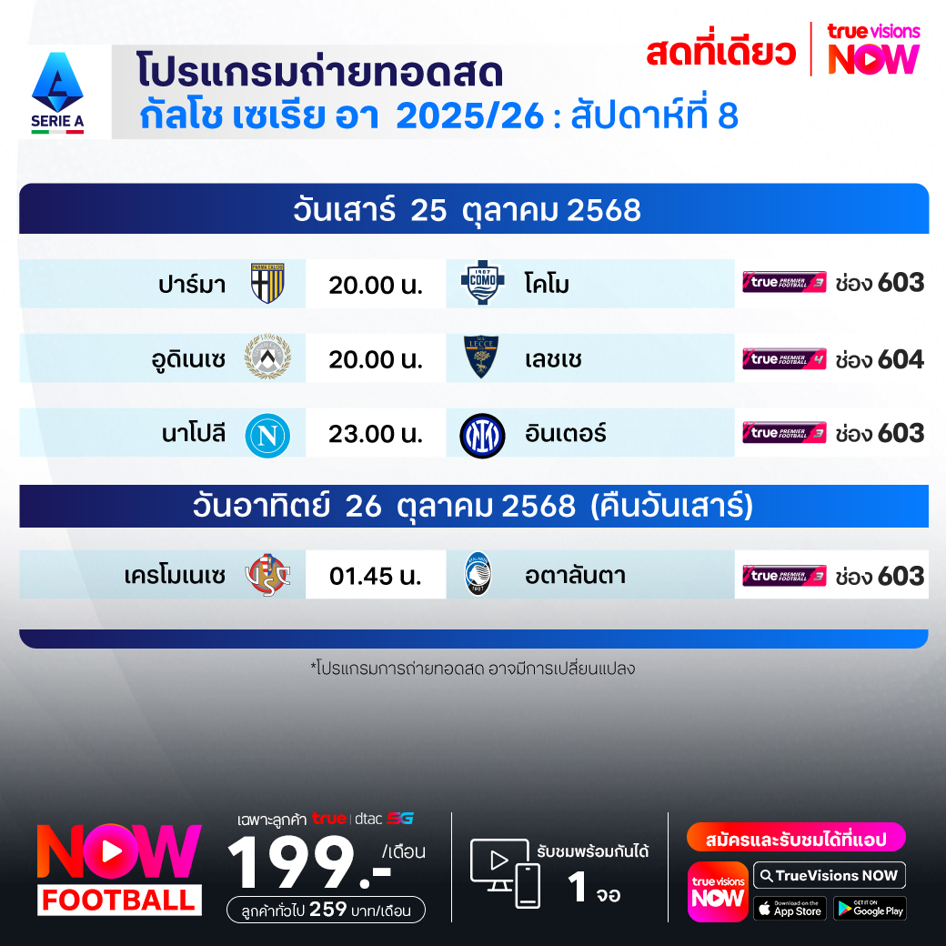 Parma vs Como เวลา 20.00-22.00 ทางช่องTPF 3(603)