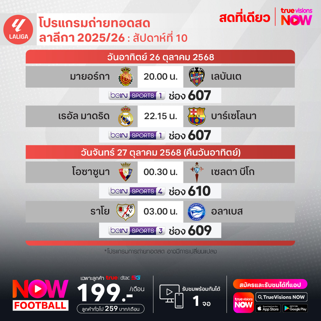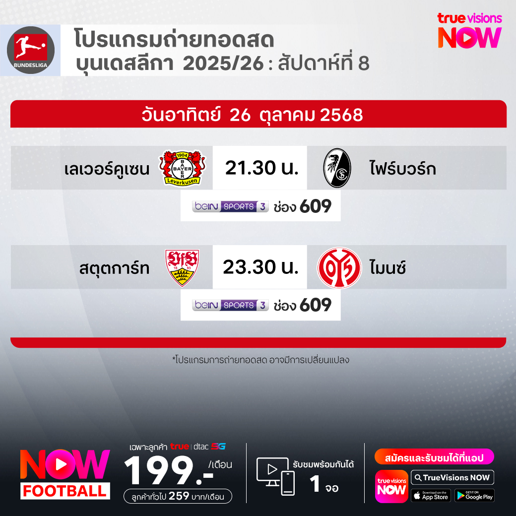วันนี้มีอะไรดูที่ ทรูวิชั่นส์ ประจำวันอาทิตย์ที่ 26 ตุลาคม 68 ยังคงมีกีฬาที่น่าสนใจให้ได้ตามลุ้นตามเชียร์กันเหมือนเดิม โดยในส่วนของฟุตบอลนั้นยังมีศึก ลา ลีกา สเปน, บุนเดสลีกา เยอรมนี, กัลโช่ เซเรีย อา อิตาลี และ สกอตติช พรีเมียร์ชิพ ให้ได้ตามเชียร์กันต่อ ส่วนกีฬาอื่นๆ คอมอเตอร์สปอร์ตพลาดไม่ได้กับศึก ฟอร์มูล่า วัน รายการ กรังด์ปรีซ์ ออฟ เม็กซิโก และ โมโต จีพี รายการ กรังด์ปรีซ์ ออฟ มาเลเซีย นอกจากนี้ยังมีเทนนิส เอทีพี ทัวร์ รายการ เวียนนา โอเพ่น, ดับเบิ้ลยูทีเอ ทัวร์ รายการ แปซิฟิก โอเพ่น, กอล์ฟ พีจีเอ ทัวร์ รายการ แบงค์ ออฟ ยูท่าห์ แชมเปี้ยนชิพ, แอลพีจีเอ ทัวร์ รายการ อินเตอร์เนชั่นแนล คราวน์, เวิลด์ สนุกเกอร์ ทัวร์ รายการ นอร์ธเทิร์น ไอร์แลนด์ โอเพ่น, แบดมินตัน บีดับเบิ้ลยูเอฟ รายการ เฟร้นช์ โอเพ่น, วอลเลย์บอล วี-ลีก และ ฟุตซอลไทยลีก งานนี้ ทรูวิชั่นส์ จัดเต็มให้ชมกันถึงบ้าน