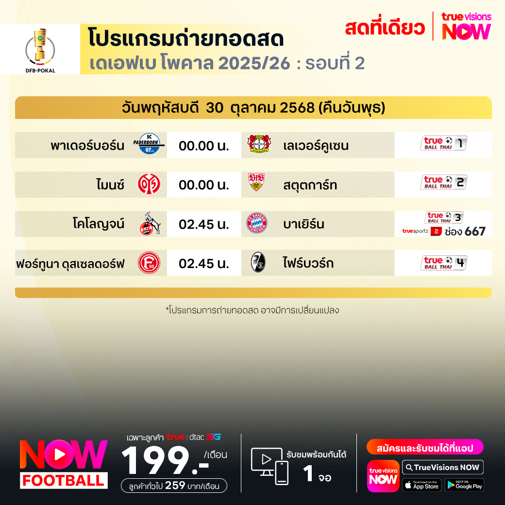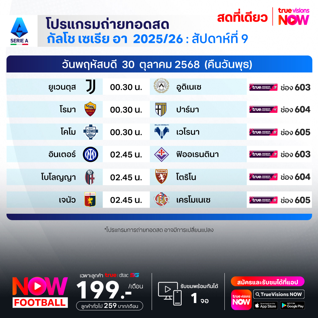 วันนี้มีอะไรดูที่ ทรูวิชั่นส์ ประจำวันพุธที่ 29 ตุลาคม 68 ยังคงมีกีฬาที่น่าสนใจให้ได้ตามลุ้นตามเชียร์กันเหมือนเดิม โดยในส่วนของฟุตบอลนั้นยังมีศึก กัลโช่ เซเรีย อา อิตาลี, เดเอฟเบ โพคาล และ สกอตติช พรีเมียร์ชิพ ให้ได้ตามเชียร์กันต่อ ส่วนกีฬาอื่นๆ ยังมีเทนนิส เอทีพี ทัวร์ รายการ ปารีส มาสเตอร์ส, เมเจอร์ ลีก เบสบอล เวิลด์ ซีรี่ส์ และ วอลเลย์บอล วี-ลีก งานนี้ ทรูวิชั่นส์ จัดเต็มให้ชมกันถึงบ้าน