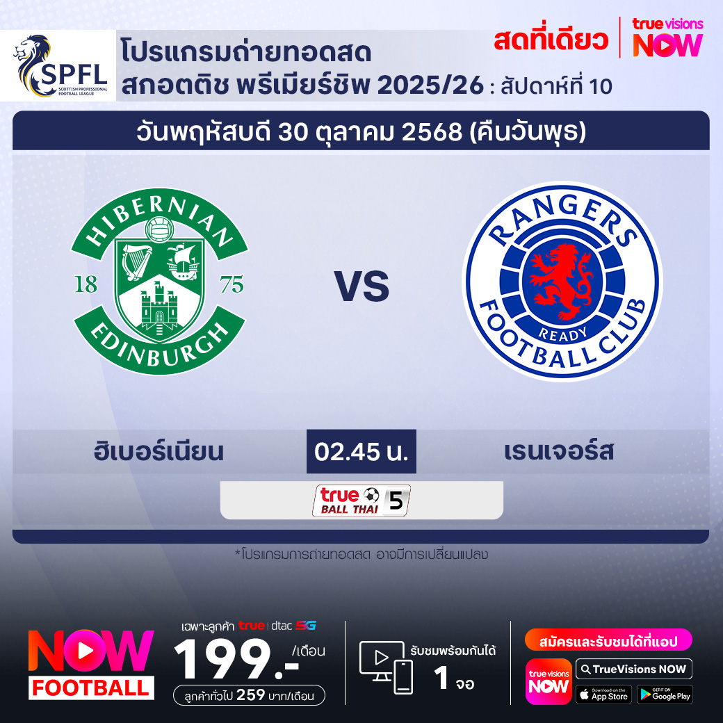 Hibernian vs Rangers เวลา 02.45-04.45 ทางช่อง True Ball Thai 5