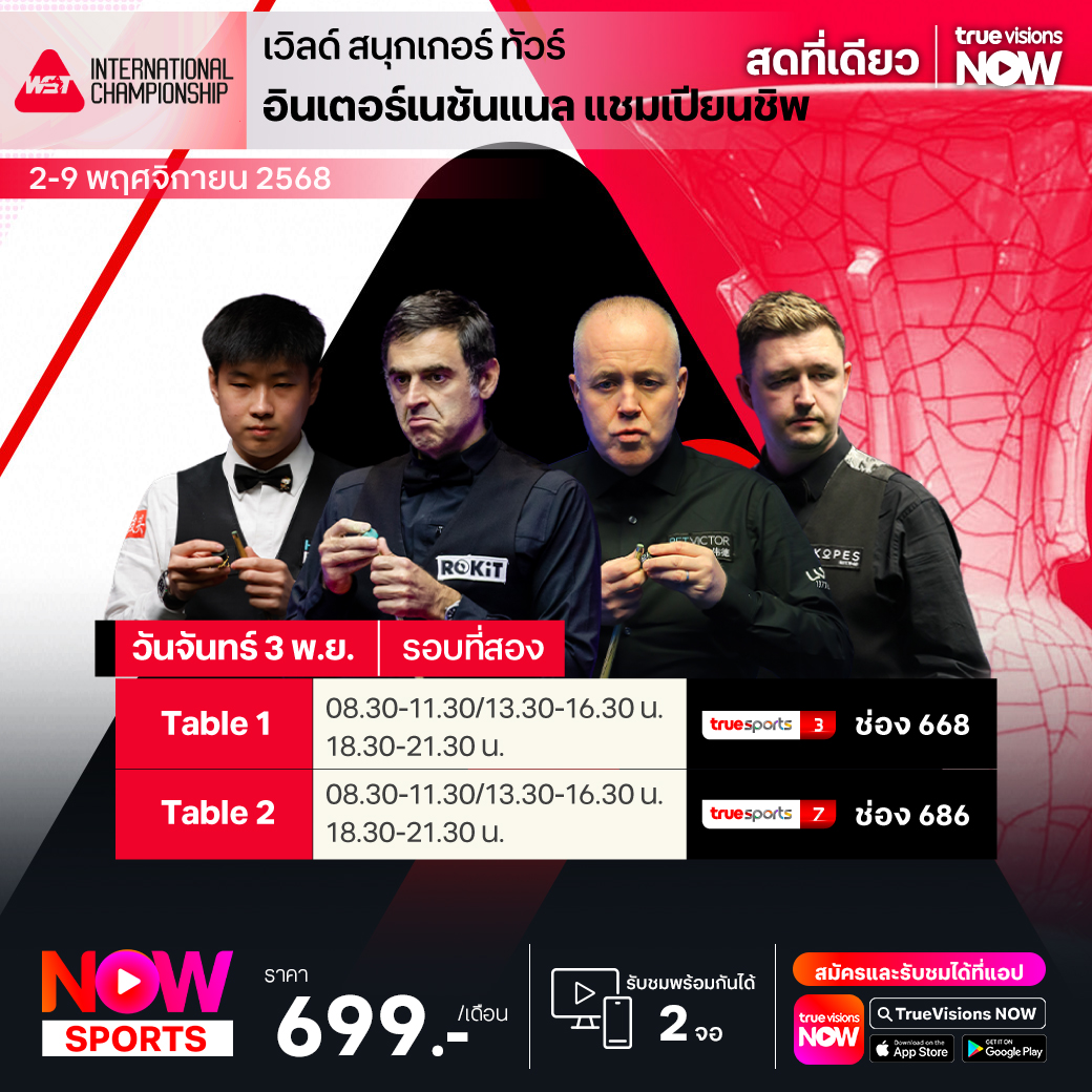 เวิลด์ สนุกเกอร์ ทัวร์ สัปดาห์นี้มุ่งหน้าสู่ประเทศจีนอีกครั้ง บรรดานักสอยคิวระดับท็อปมากันแบบครบครัน เพื่อร่วมเก็บคะแนนสะสมและลุ้นแชมป์ในรายการใหญ่อย่าง อินเตอร์เนชั่นแนล แชมเปี้ยนชิพ 2025 ที่เมืองหนานจิง ลุ้นกันแบบไม้ต่อไม้ เฟรมต่อเฟรม แมตช์ต่อแมตช์ เกมที่ไม่มีที่ว่างสำหรับผู้แพ้ ใครจะได้ไปต่อถึงตำแหน่งแชมป์ ชมสด ครบทุกรอบ ที่ ทรูวิชั่นส์