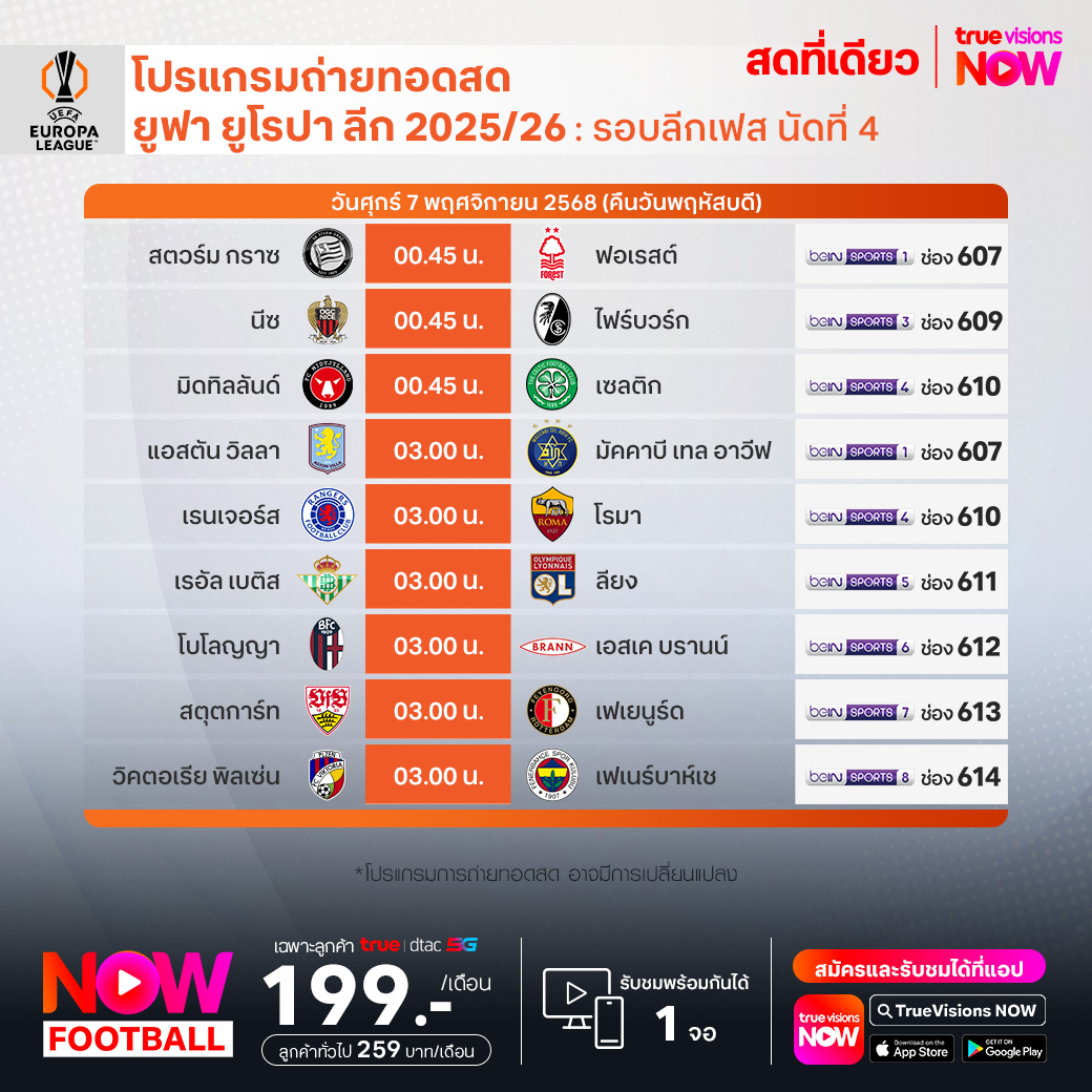 วันนี้มีอะไรดูที่ ทรูวิชั่นส์ ประจำวันพฤหัสบดีที่ 6 พฤศจิกายน 68 ยังคงมีกีฬาที่น่าสนใจให้ได้ตามลุ้นตามเชียร์กันเหมือนเดิม โดยในส่วนของฟุตบอลนั้นยังมีศึก ยูฟ่า ยูโรป้า ลีก และ ยูฟ่า คอนเฟอเรนซ์ ลีก รอบ ลีก เฟส ให้ได้ตามเชียร์กันต่อ ส่วนกีฬาอื่นๆ ยังมีเทนนิสหญิง ดับเบิ้ลยูทีเอ ไฟนอลส์, กอล์ฟ พีจีเอ ทัวร์ รายการ เวิลด์ ไวด์ เทคโนโลยี แชมเปี้ยนชิพ, ดีพี เวิลด์ ทัวร์ รายการ อาบูดาบี เอชเอสบีซี แชมเปี้ยนชิพ, แอลพีจีเอ ทัวร์ รายการ โตโต้ เจแปน คลาสสิก, เวิลด์ สนุกเกอร์ ทัวร์ รายการ อินเตอร์เนชั่นแนล แชมเปี้ยนชิพ, วอลเลย์บอล วี-ลีก และ ฟุตซอลไทยลีก งานนี้ ทรูวิชั่นส์ จัดเต็มให้ชมกันถึงบ้าน