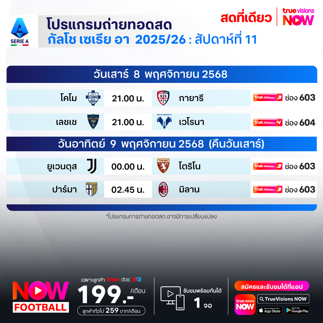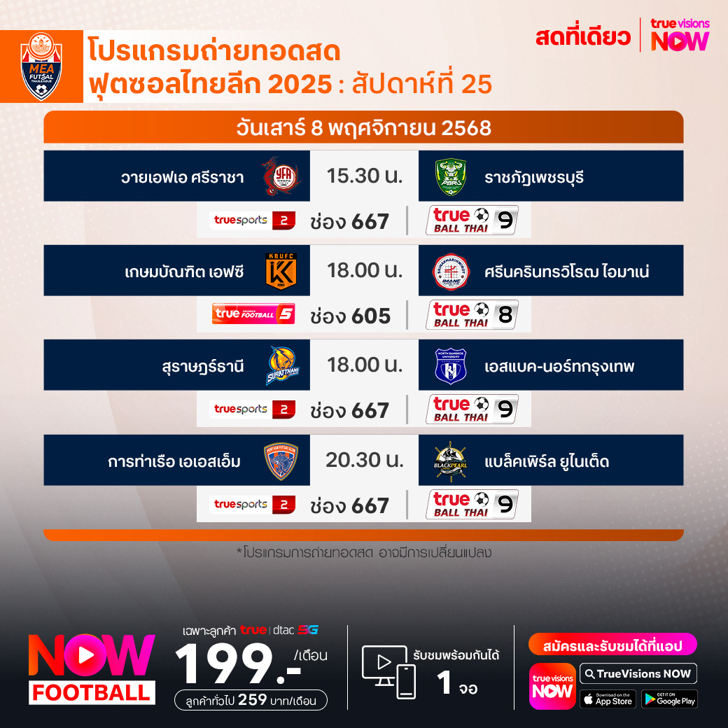 วันนี้มีอะไรดูที่ ทรูวิชั่นส์ ประจำวันเสาร์ที่ 8 พฤศจิกายน 68 ยังคงมีกีฬาที่น่าสนใจให้ได้ตามลุ้นตามเชียร์กันเหมือนเดิม โดยในส่วนของฟุตบอลนั้นยังมีศึก ลา ลีกา สเปน, บุนเดสลีกา เยอรมนี, กัลโช่ เซเรีย อา อิตาลี, สกอตติช พรีเมียร์ชิพ, ลีกา 2 เยอรมนี, เอ-ลีก ออสเตรเลีย และ ซาอุดิ โปร ลีก ให้ได้ตามเชียร์กันต่อ ส่วนคอมอเตอร์สปอร์ต พลาดไม่ได้กับศึก ฟอร์มูล่า วัน รายการ กรังด์ปรีซ์ ออฟ เซา เปาโล และ โมโต จีพี รายการ กรังด์ปรีซ์ ออฟ ปอร์ตูกัล ส่วนกีฬาอื่นๆ ยังมีเทนนิสหญิง ดับเบิ้ลยูทีเอ ไฟนอลส์, กอล์ฟ พีจีเอ ทัวร์ รายการ เวิลด์ ไวด์ เทคโนโลยี แชมเปี้ยนชิพ, ดีพี เวิลด์ ทัวร์ รายการ อาบูดาบี เอชเอสบีซี แชมเปี้ยนชิพ, แอลพีจีเอ ทัวร์ รายการ โตโต้ เจแปน คลาสสิก, เวิลด์ สนุกเกอร์ ทัวร์ รายการ อินเตอร์เนชั่นแนล แชมเปี้ยนชิพ, แบดมินตัน บีดับเบิ้ลยูเอฟ รายการ โคเรีย มาสเตอร์ส, ยูเอฟซี ไฟต์ ไนท์, วอลเลย์บอล วี-ลีก และ ฟุตซอลไทยลีก งานนี้ ทรูวิชั่นส์ จัดเต็มให้ชมกันถึงบ้าน