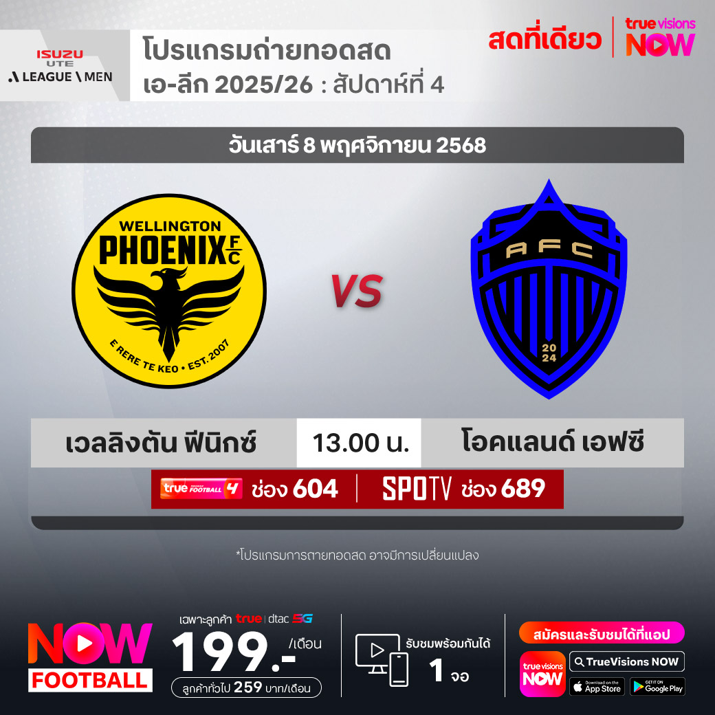 Wellington Phoenix vs Auckland เวลา 13.00-15.00 ทางช่องTPF 4(604) / SPOTV (689)