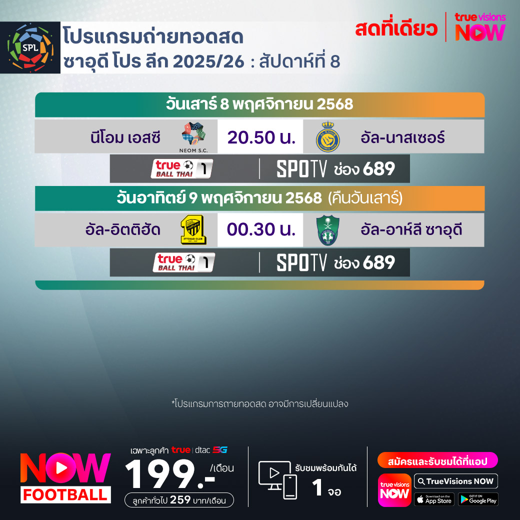 Neom vs Al Nassr เวลา 20.50-22.50 ทางช่อง True Ball Thai 1 /SPOTV (689)