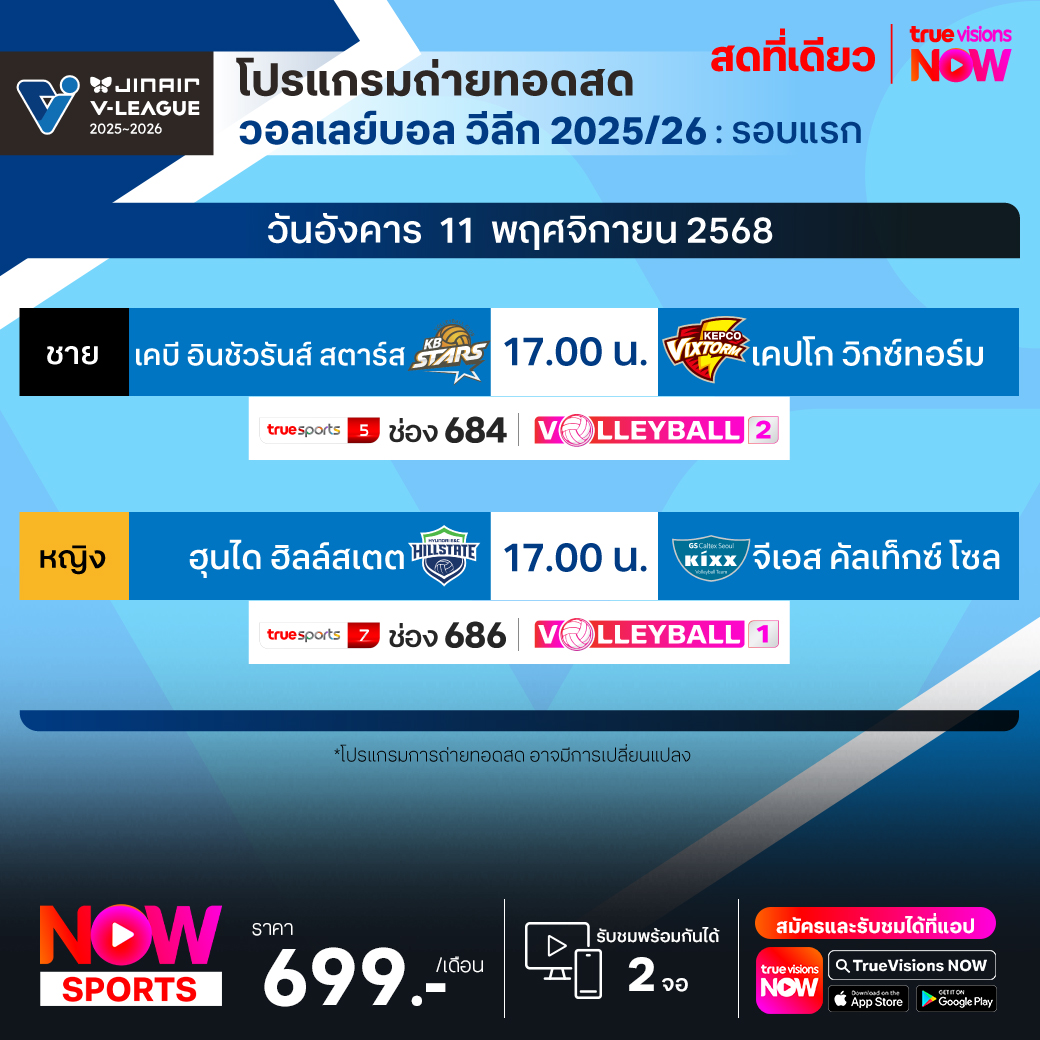 ฮุนได ฮิลล์สเตต พบ จีเอส คัลเท็กซ์ โซล เวลา 17.00 ทางช่อง TS 7 (686) / Volleyball 1