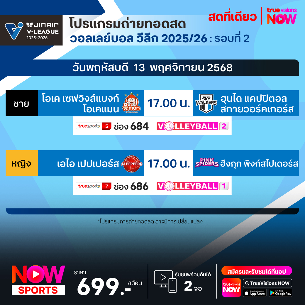 โอเค เซฟวิงส์แบงก์ โอเคแมน พบ ฮุนได แคปปิตอล สกายวอร์คเกอร์ส เวลา 17.00 ทางช่อง TS 5 (684) / Volleyball 2