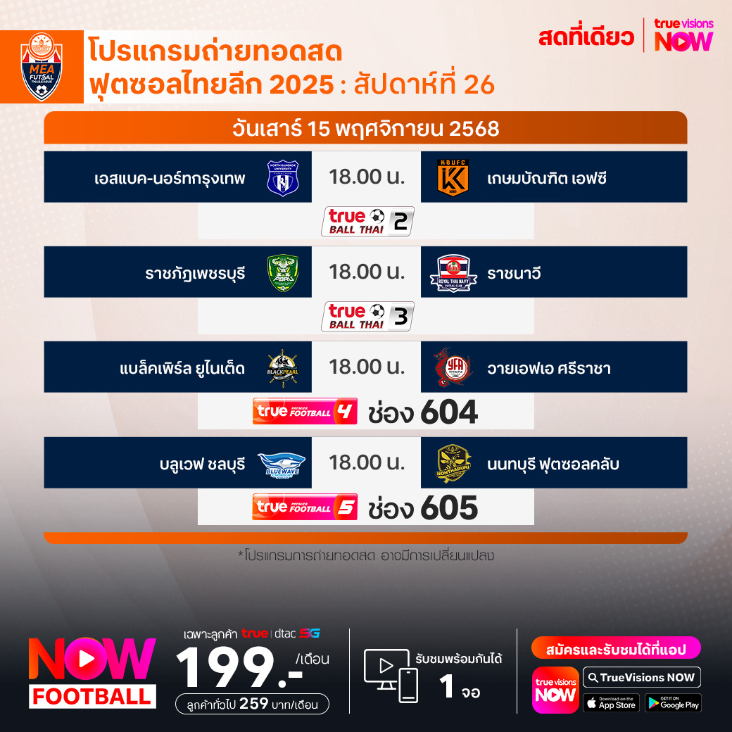 เอสแบค-นอร์ทกรุงเทพ พบ เกษมบัณฑิต เอฟซี เวลา 18.00 ทางช่อง True Ball Thai 2