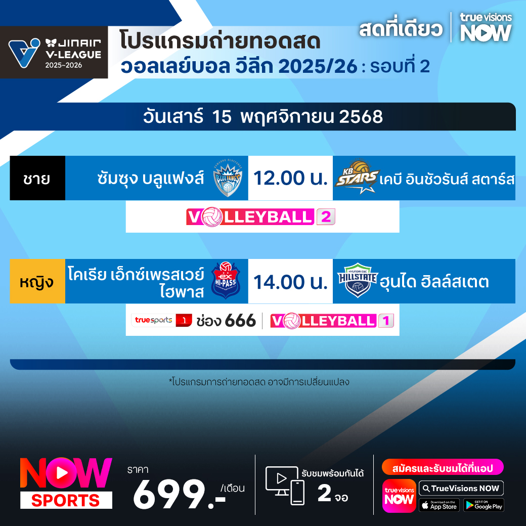 ซัมซุง บลูแฟงส์ พบ เคบี อินชัวรันส์ สตาร์ส เวลา 12.00 ทางช่อง Volleyball 2