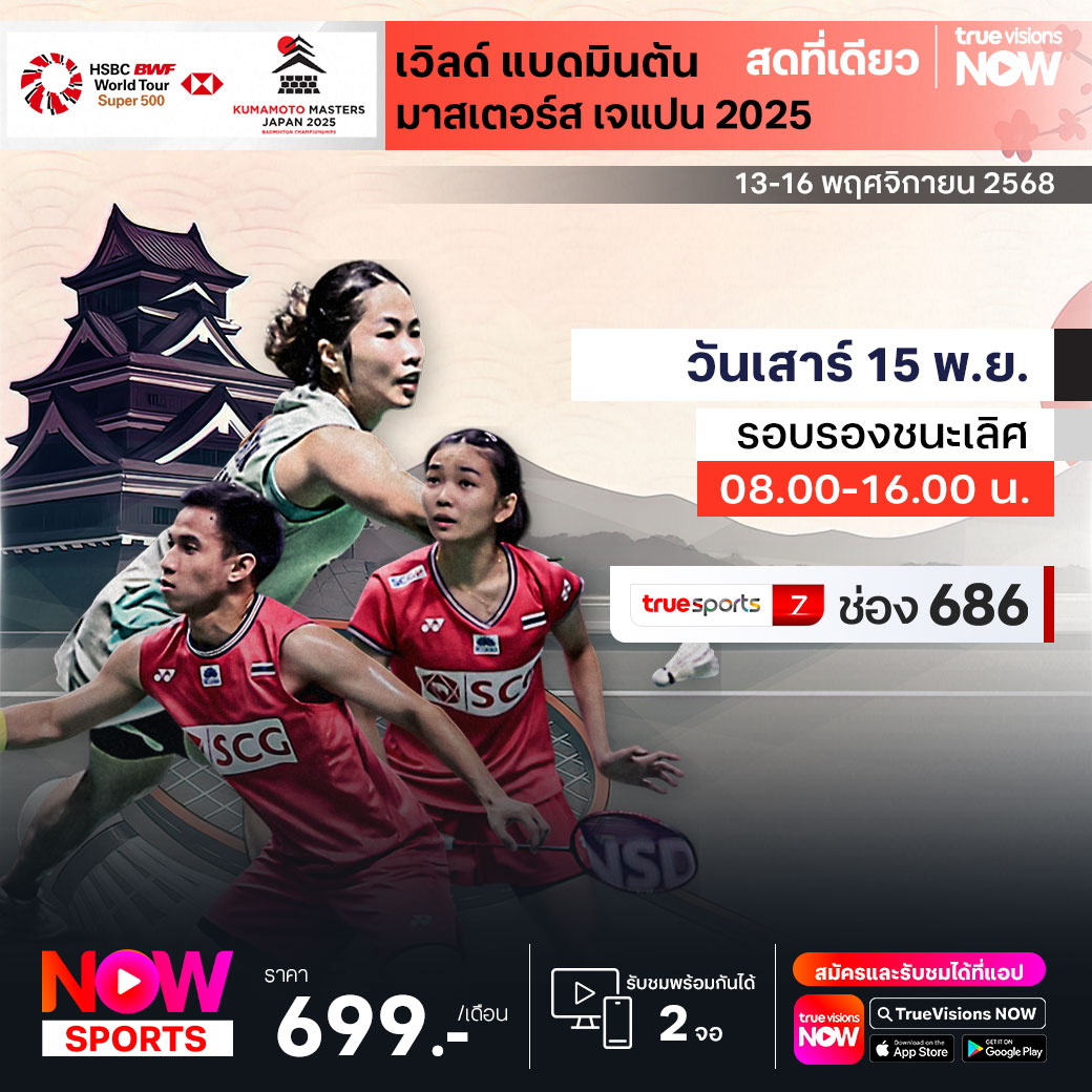 แฟนๆ กีฬาแบดมินตัน ห้ามพลาดกับการแช่งขันแบดมินตันเก็บคะแนนสะสมโลกช่วงโค้งสุดท้ายของฤดูกาล 2025 สัปดาห์นี้ ไประเบิดความมันส์กันที่ประเทศญี่ปุ่น กับรายการแห่งศักดิ์ศรี ระดับเวิลด์ ทัวร์ ซูเปอร์ 500 คุมาโมโตะ มาสเตอร์ส เจแปน บรรดามือดีของเจ้าถิ่นลงสนามกันแบบครบๆ พร้อมด้วยนักกีฬาต่างชาติที่มาลุ้นแชมป์เช่นเดียวกับทีมนักแบดมินตันไทย เชียร์สะใจ ที่ ทรูวิชั่นส์