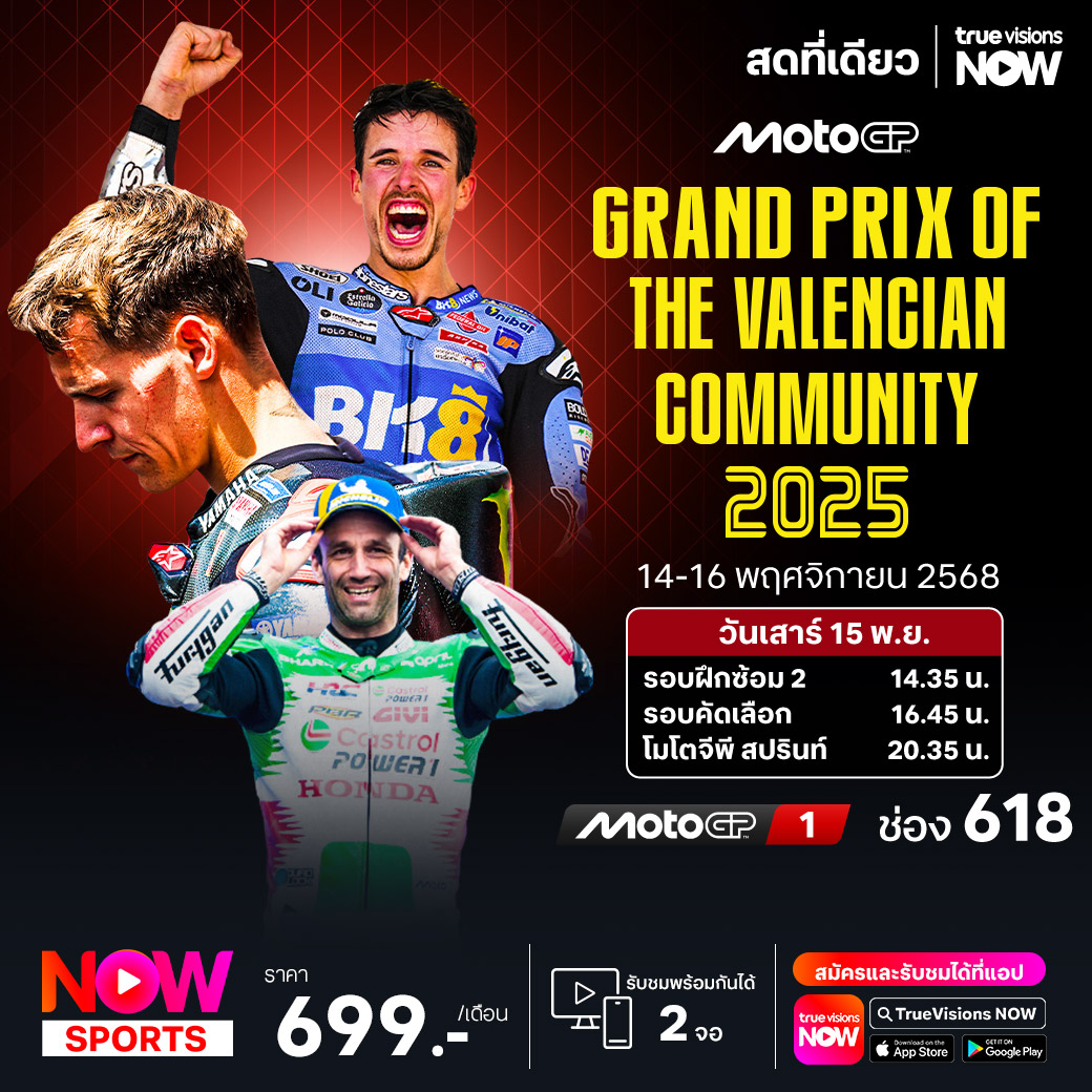 ศึก โมโต จีพี เวิลด์ แชมเปี้ยนชิพ ดวลเดือดตลอดทั้งปีมาแล้ว 21 สนามทั่วโลก สัปดาห์นี้ถึงเวลาสำคัญของสนามสุดท้าย มาบิดสุดไมล์ สั่งลากันให้สะใจ ที่เมืองบาเลนเซีย ประเทศสเปน กับสนามที่ 22 กรังด์ปรีซ์ ออฟ บาเลนเซียน คอมมูนิตี้ ที่สังเวียน ริคาร์โก้ ตอร์โม่ ใครจะได้ยืนบนโพเดี้ยม ทั้งในรุ่น โมโต 3, โมโต 2 และ โมโต จีพี ลุ้นกันสดๆ ครบทุกช่วงการแข่งขัน ที่ ทรูวิชั่นส์