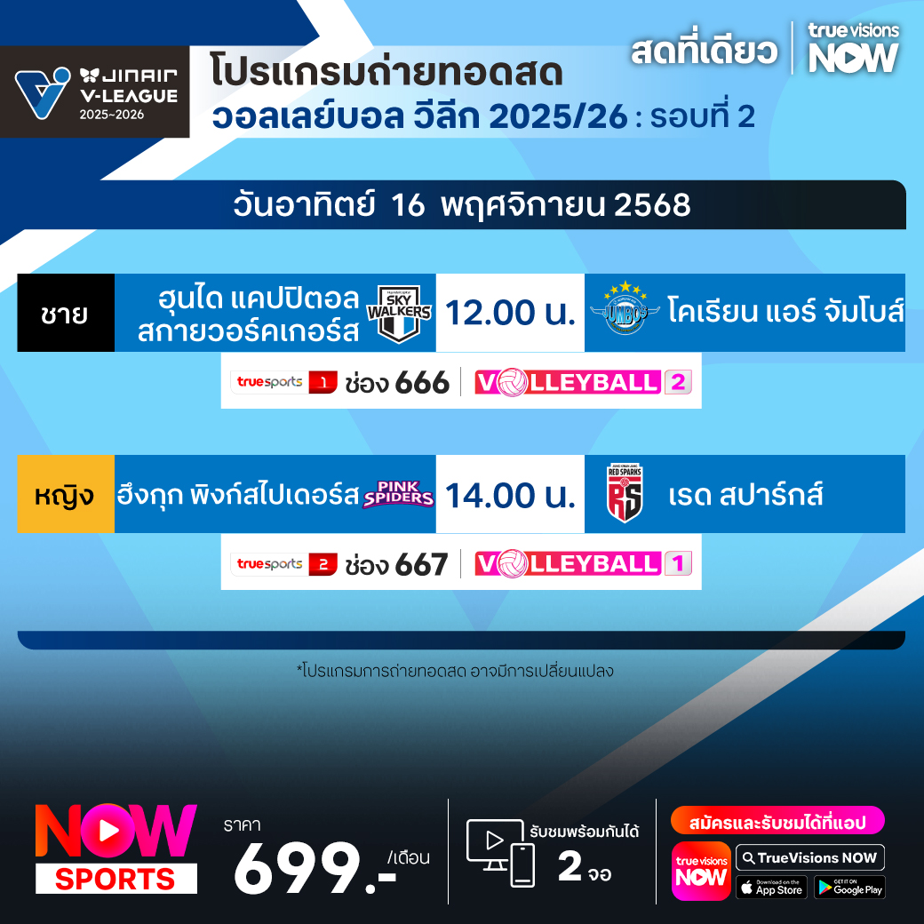 ฮุนได แคปปิตอล สกายวอร์คเกอร์ส พบ โคเรียน แอร์ จัมโบส์ เวลา 12.00 ทางช่อง TS 1 (666) / Volleyball 2