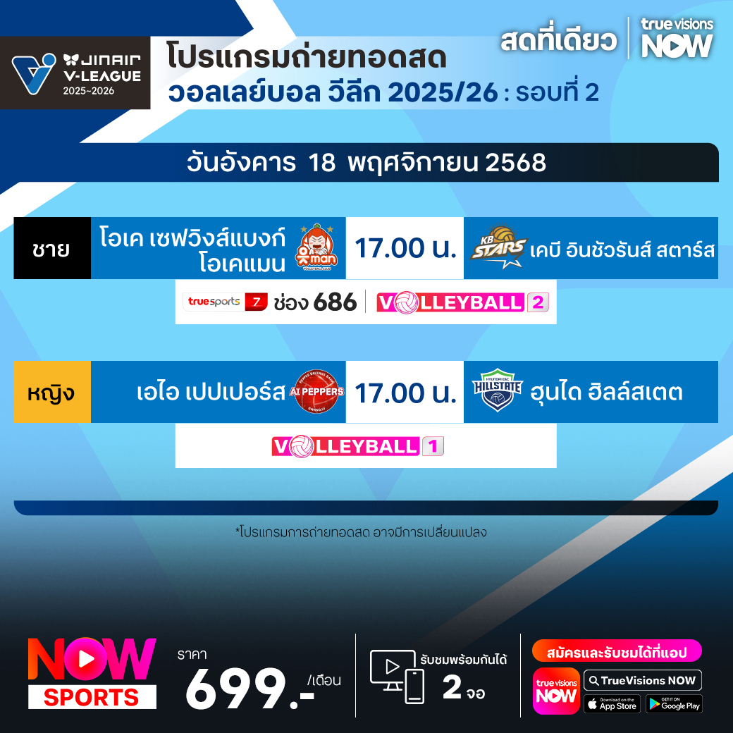 โอเค เซฟวิงส์แบงก์ โอเคแมน พบ เคบี อินชัวรันส์ สตาร์ส เวลา 17.00 ทางช่อง TS 7 (686) / Volleyball 2