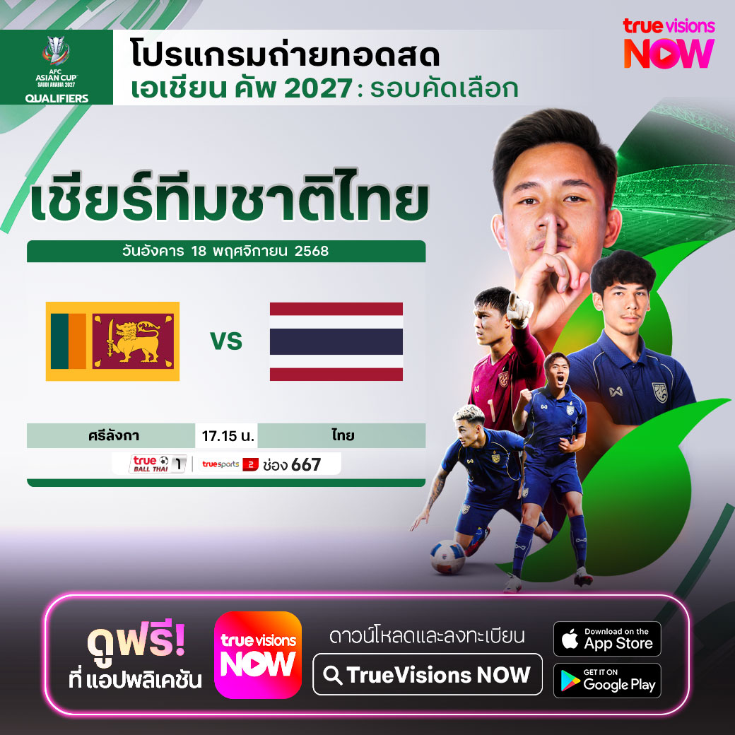 วันนี้มีอะไรดูที่ ทรูวิชั่นส์ ประจำวันอังคารที่ 18 พฤศจิกายน 68 ยังคงมีกีฬาที่น่าสนใจให้ได้ตามลุ้นตามเชียร์กันเหมือนเดิม โดยในส่วนของฟุตบอลนั้นมีศึก เอเชียน คัพ 2027 รอบคัดเลือก ศรีลังกา พบ ไทย ให้ได้ตามเชียร์ ส่วนกีฬาอื่นๆ ยังมีเทนนิส เดวิส คัพ 2025 และ วอลเลย์บอล วี-ลีก งานนี้ ทรูวิชั่นส์ จัดเต็มให้ชมกันถึงบ้าน