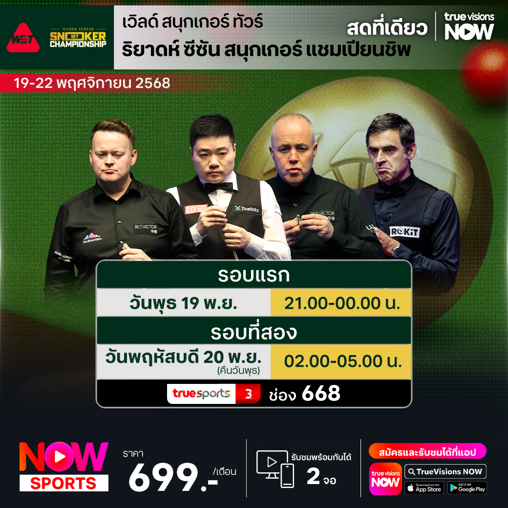 อะไรจะเกิดขึ้น เมื่อสุดยอดนักสนุกเกอร์ที่เก่งที่สุดในโลก 10 คน มารวมตัวกัน นำโดย รอนนี่ โอซัลลิแวน และแชมป์เก่า มาร์ค อัลเลน เพื่อวัดความคมและความแม่น ในการแข่งขัน รายการที่แฟนๆ ทั่วโลกเฝ้ารอคอย ในศึก เวิลด์ สนุกเกอร์ ทัวร์ รายการ ริยาดห์ ซีซั่น สนุกเกอร์ แชมเปี้ยนชิพ ที่เจ้าภาพทุ่มทุนแบบไม่อั้นกับเงินรางวัลล่อใจ และเพิ่มเติมโบนัสถึง 1 ล้านเหรียญสหรัฐฯ สำหรับการทำแม็กซิมั่มเบรก 167 คะแนน ที่มีแค่รายการนี้รายการเดียว ชมสด ครบทุกรอบ ที่ ทรูวิชั่นส์