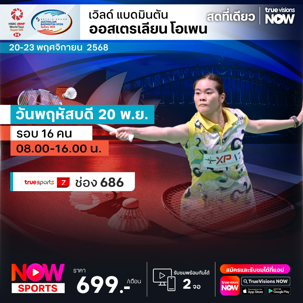 แบดมินตันเก็บคะแนนสะสมโลก ใกล้มาถึงไคลแม็กซ์แล้ว ทุกชัยชนะและทุกคะแนนสะสมต่อจากนี้ ถือว่าสำคัญสุดๆ สัปดาห์นี้พบกับรายการ ออสเตรเลียน โอเพ่น ทัวร์นาเมนต์ระดับ เวิลด์ ทัวร์ ซูเปอร์ 500 ที่เควยี เซนเตอร์, โอลิมปิก บูโลวาร์ด, ซิดนี่ย์ ประเทศออสเตรเลีย ร่วมเชียร์ทีมแบดมินตันไทย สู้กับมือระดับโลกเพื่อลุ้นคว้าแชมป์ ชมสด ครบทุกรอบ ที่ ทรูวิชั่นส์