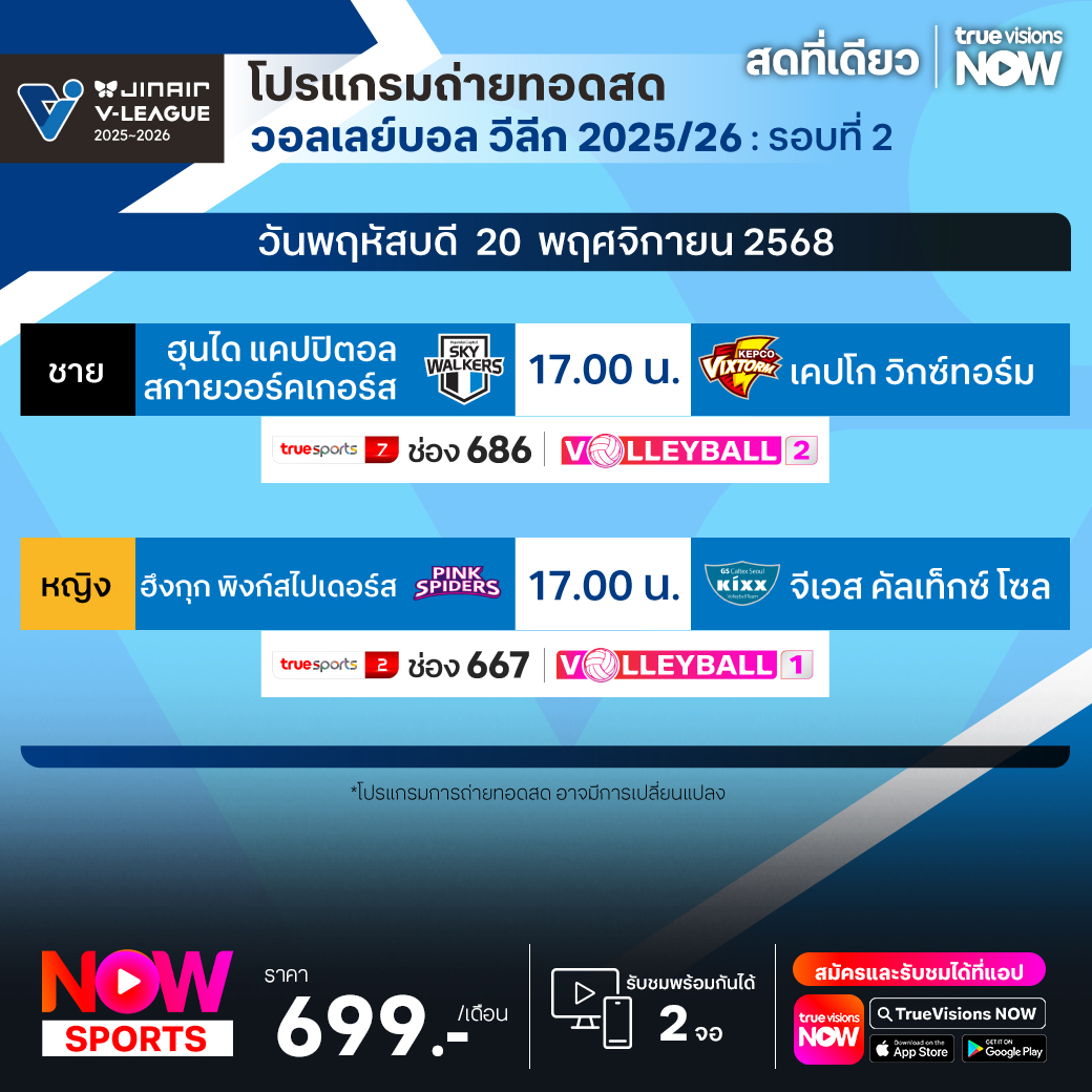 ฮึงกุก พิงก์สไปเดอร์ส พบ จีเอส คัลเท็กซ์ โซล เวลา 17.00 ทางช่อง TS 2 (667) / Volleyball 1