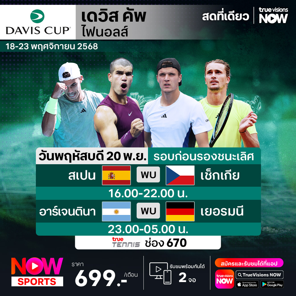 เทนนิสประเภททีมชายชิงแชมป์โลก รายการเดวิส คัพ 2025 เข้าสู่รอบชิงชนะเลิศ โดยมี 8 ประเทศที่แข็งแกร่งที่สุดผ่านเข้ามาชิงชัย เจ้าภาพ อิตาลี จะป้องกันแชมป์ได้อีกสมัย หรือจะเป็น สเปน ที่นำโดย คาร์ลอส อัลคาราซ, เยอรมนี ที่นำโดย อเล็กซานเดอร์ ซเวเรฟ และชาติอื่นๆ อีก 5 ประเทศ ร่วมลุ้นกันว่าชาติไหนจะคว้าแชมป์รายการนี้ไปครอง ชมสด ที่ ทรูวิชั่นส์